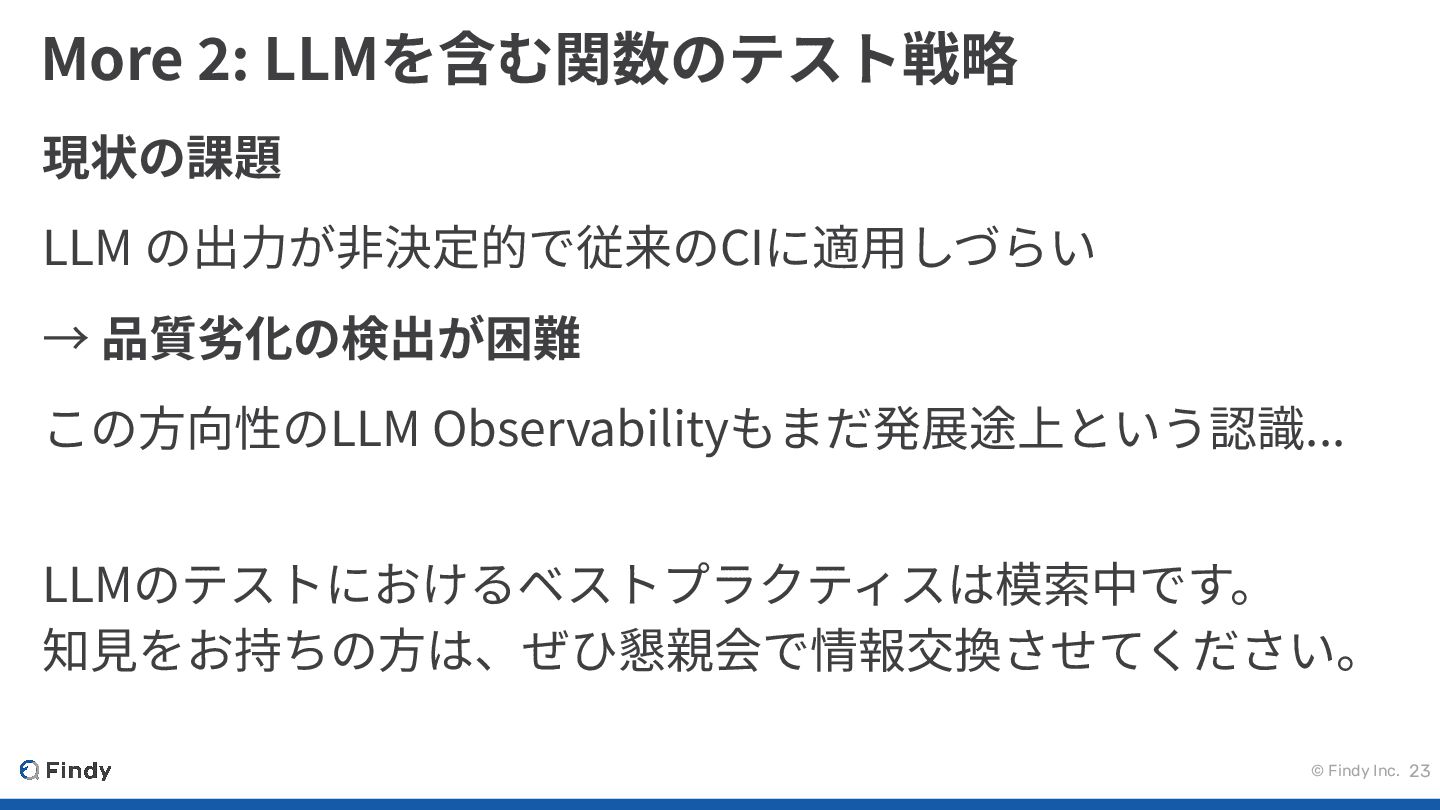 © Findy Inc. More 2: LLMを含む関数のテスト戦略 23 現状の課題 LLM の出⼒が⾮決定的で従来のCIに適⽤しづらい
