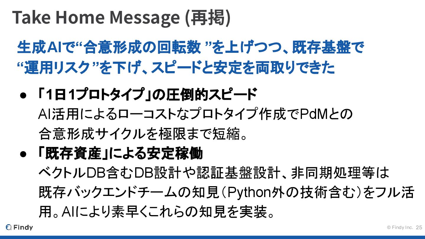 ”を下げ、スピードと安定を両取りできた • 「1日1プロトタイプ」の圧倒的スピード AI活用によるローコストなプロトタイプ作成でプロダクト マネージャー (PdM) との合意形成サイクルを極限まで短縮。 • 「既存資産」による安定稼働 ベクトルDB含むDB設計や認証基盤設計、非同期処理等は 既存バックエンドチームの知見(Python外の技術含む)をフル活 用。AIにより素早くこれらの知見を実装。