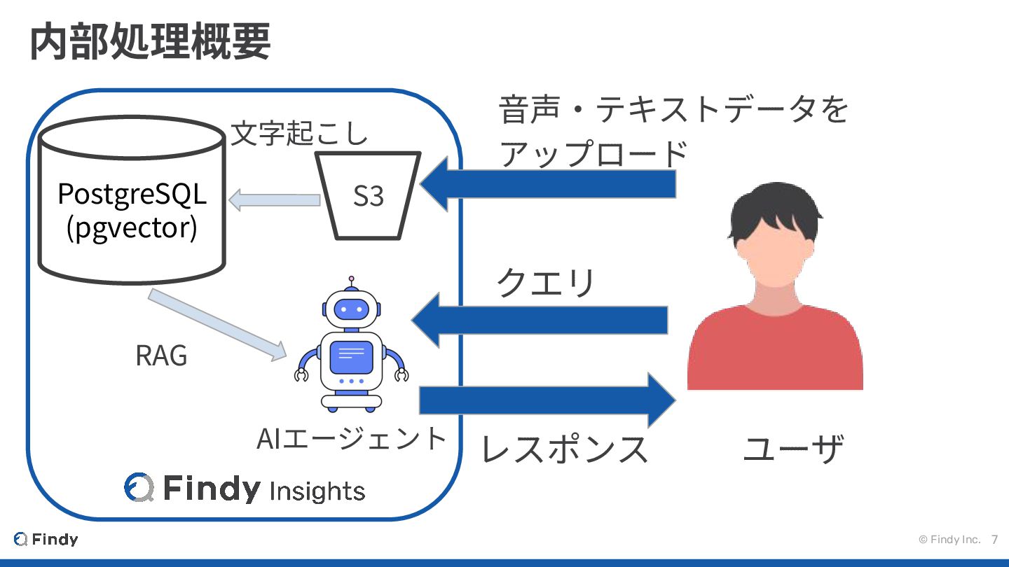 © Findy Inc. 内部処理概要 7 ⾳声‧テキストデータを アップロード PostgreSQL (pgvector) ユーザ