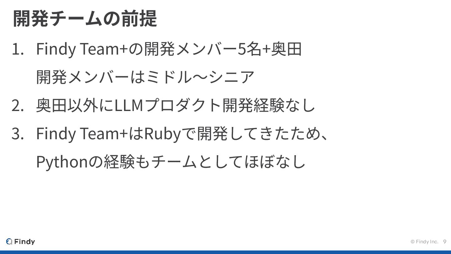 奥⽥以外にLLMプロダクト開発経験なし 3. Findy Team+はRubyで開発してきたため、 Pythonの経験もチームとしてほぼなし