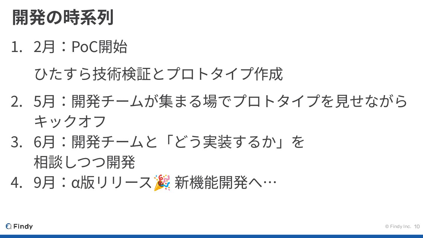 © Findy Inc. 開発の時系列 10 1. 2⽉:PoC開始 ひたすら技術検証とプロトタイプ作成 2. 5⽉:開発チームが集まる場でプロトタイプを⾒せながら