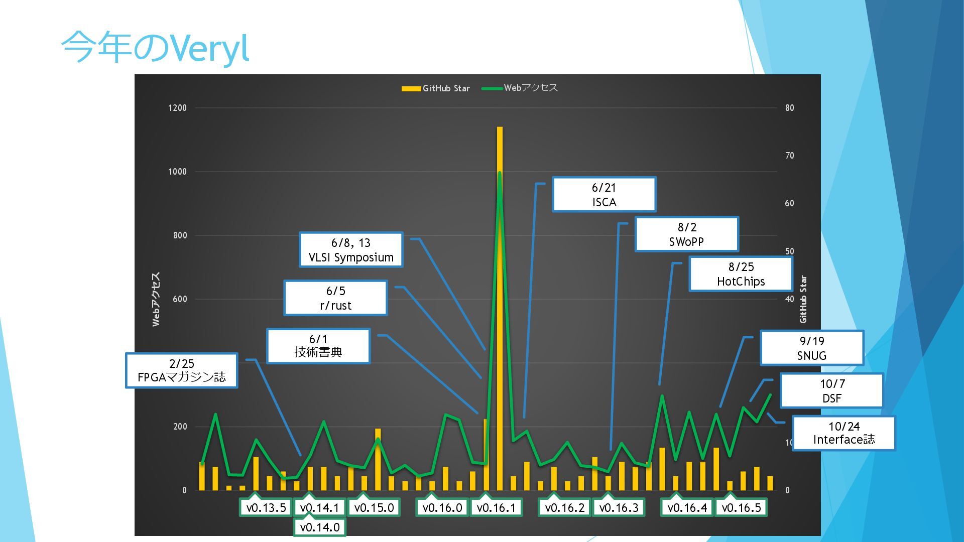 0 200 400 600 800 1000 1200 GitHub Star Webアクセス GitHub Star Webアクセス 2/25 FPGAマガジン誌 6/5 r/rust 6/1 技術書典 6/8, 13 VLSI Symposium 6/21 ISCA 8/2 SWoPP 8/25 HotChips 9/19 SNUG 10/7 DSF v0.16.5 v0.16.4 v0.16.3 v0.16.2 v0.16.1 v0.16.0 v0.14.1 v0.14.0 v0.13.5 v0.15.0 10/24 Interface誌