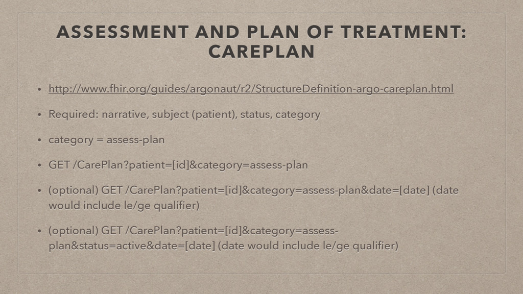 narrative, subject (patient), status, category • category = assess-plan • GET /CarePlan?patient=[id]&category=assess-plan • (optional) GET /CarePlan?patient=[id]&category=assess-plan&date=[date] (date would include le/ge qualifier) • (optional) GET /CarePlan?patient=[id]&category=assess- plan&status=active&date=[date] (date would include le/ge qualifier)