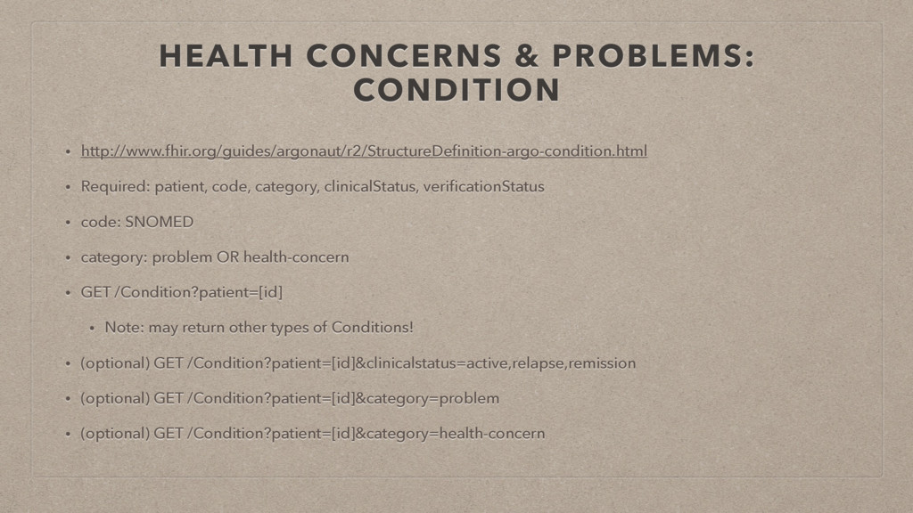 code, category, clinicalStatus, verificationStatus • code: SNOMED • category: problem OR health-concern • GET /Condition?patient=[id] • Note: may return other types of Conditions! • (optional) GET /Condition?patient=[id]&clinicalstatus=active,relapse,remission • (optional) GET /Condition?patient=[id]&category=problem • (optional) GET /Condition?patient=[id]&category=health-concern