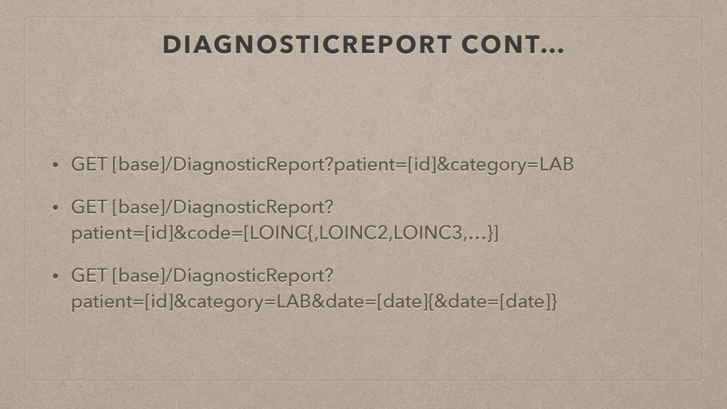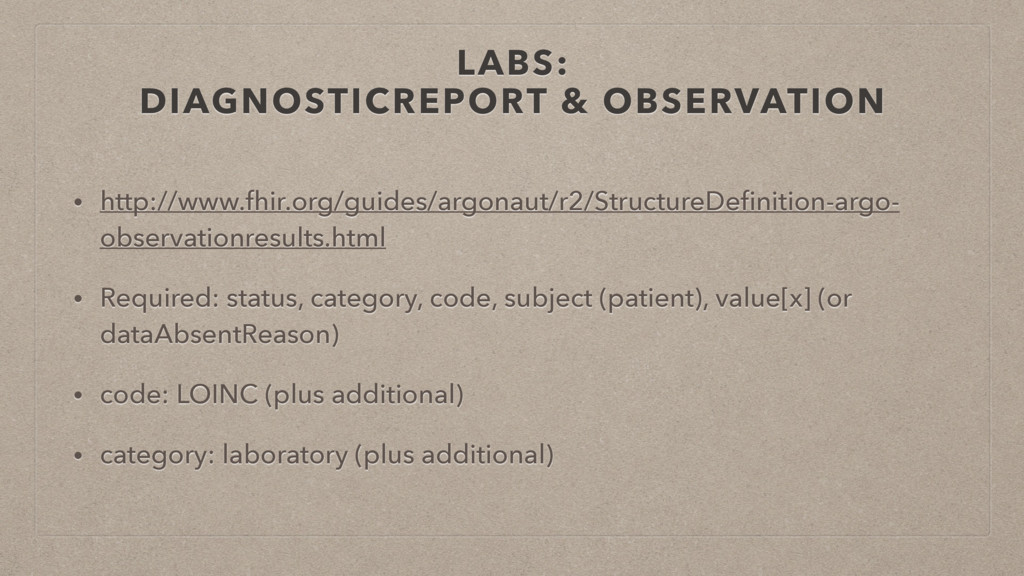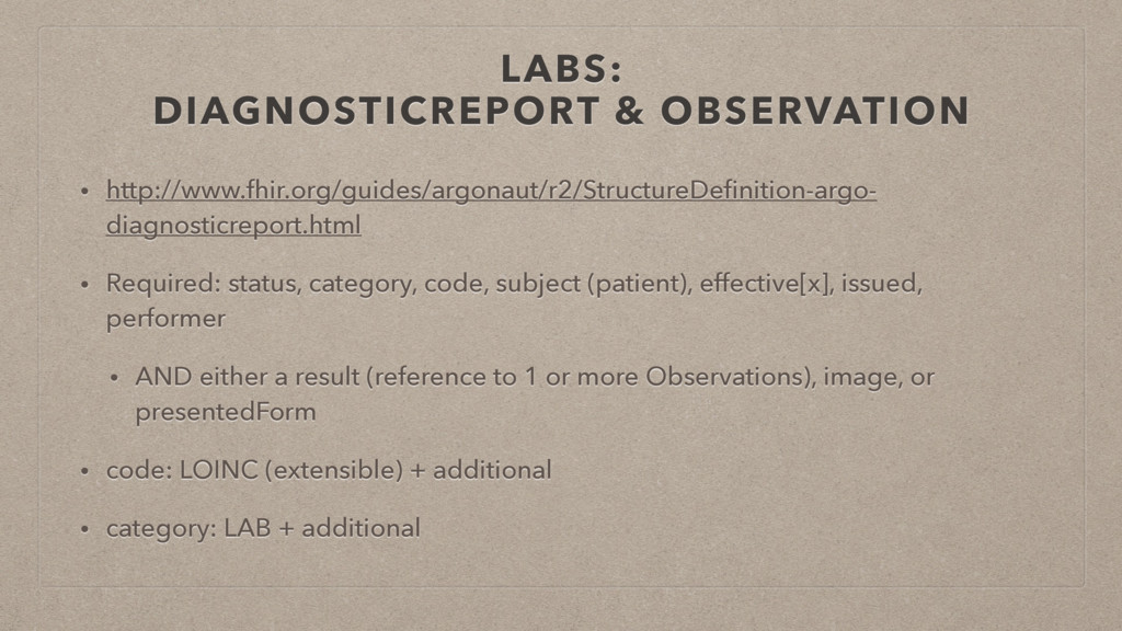 category, code, subject (patient), effective[x], issued, performer • AND either a result (reference to 1 or more Observations), image, or presentedForm • code: LOINC (extensible) + additional • category: LAB + additional