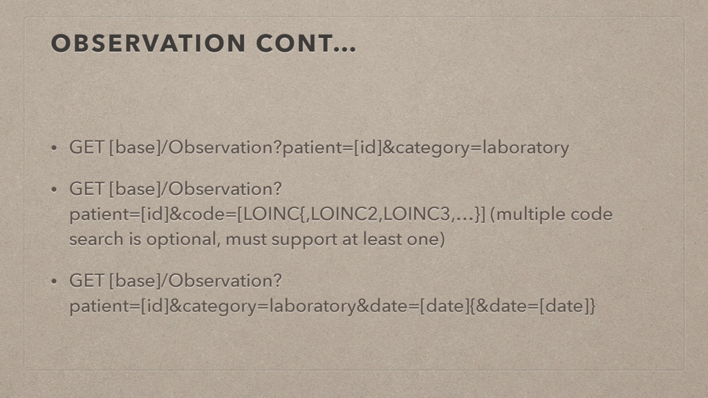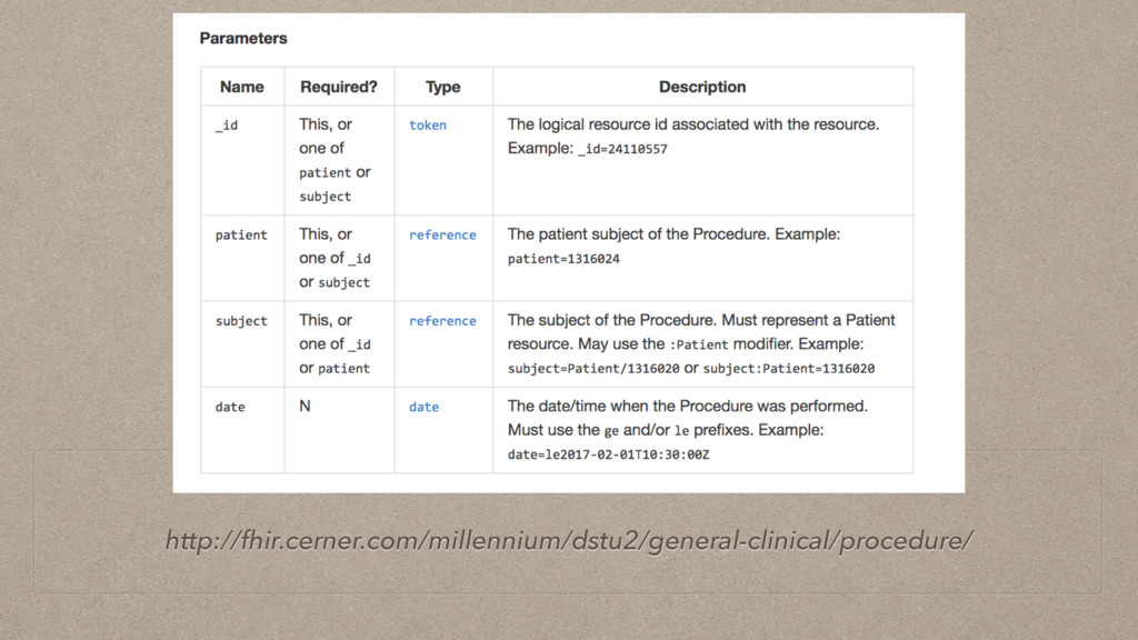 code, performed[x] • code: SNOMED, CPT-4, may also provide ICD-10-PCS • GET /Procedure?patient=[id] • GET /Procedure?patient=[id]&date=[date]{&date=[date]}