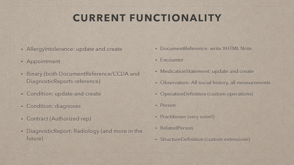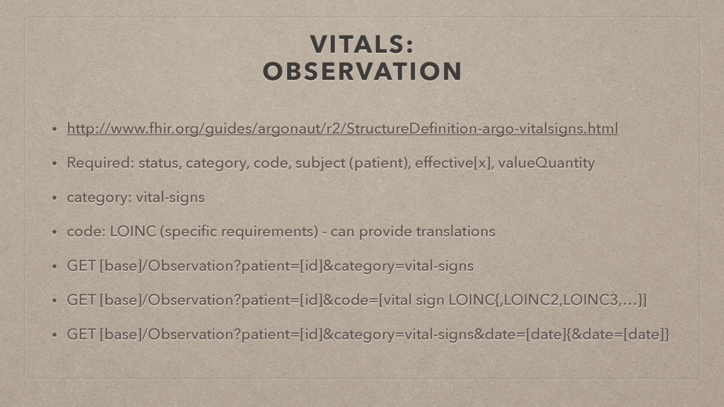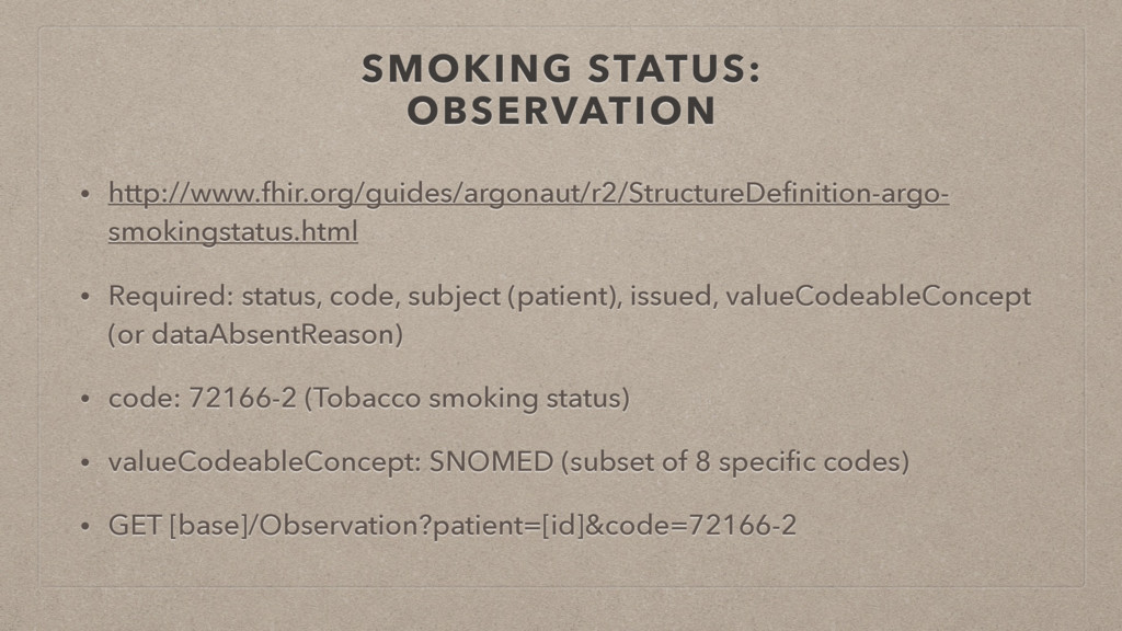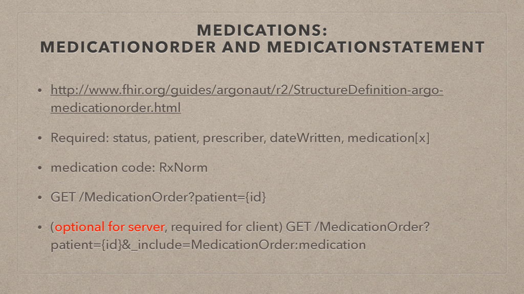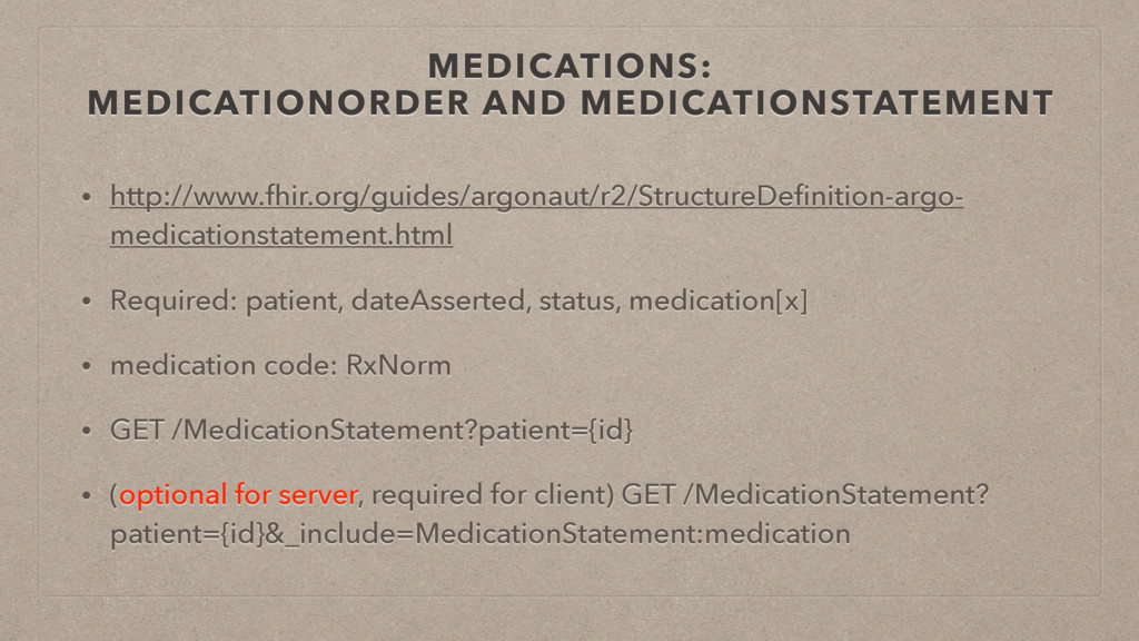 dateAsserted, status, medication[x] • medication code: RxNorm • GET /MedicationStatement?patient={id} • (optional for server, required for client) GET /MedicationStatement? patient={id}&_include=MedicationStatement:medication