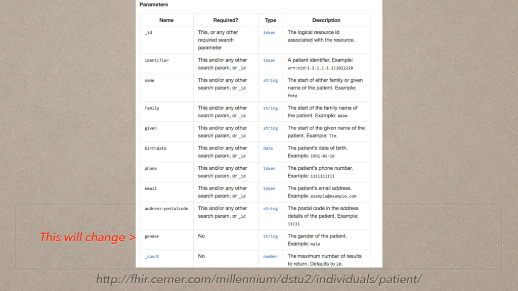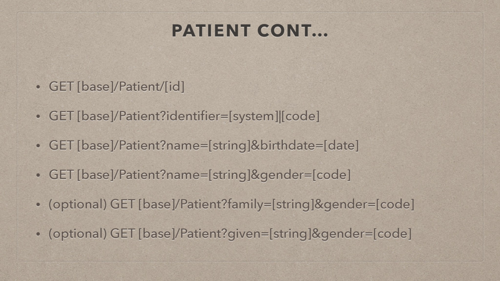 [base]/Patient?name=[string]&birthdate=[date] • GET [base]/Patient?name=[string]&gender=[code] • (optional) GET [base]/Patient?family=[string]&gender=[code] • (optional) GET [base]/Patient?given=[string]&gender=[code]
