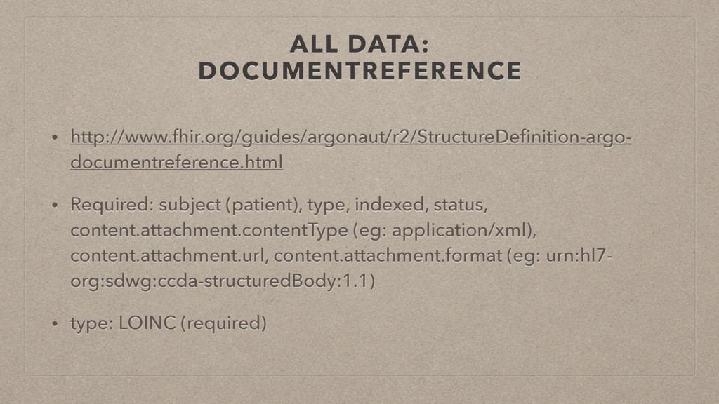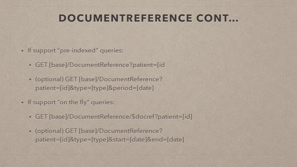 • (optional) GET [base]/DocumentReference? patient=[id]&type=[type]&period=[date] • If support “on the fly” queries: • GET [base]/DocumentReference/$docref?patient=[id] • (optional) GET [base]/DocumentReference? patient=[id]&type=[type]&start=[date]&end=[date]