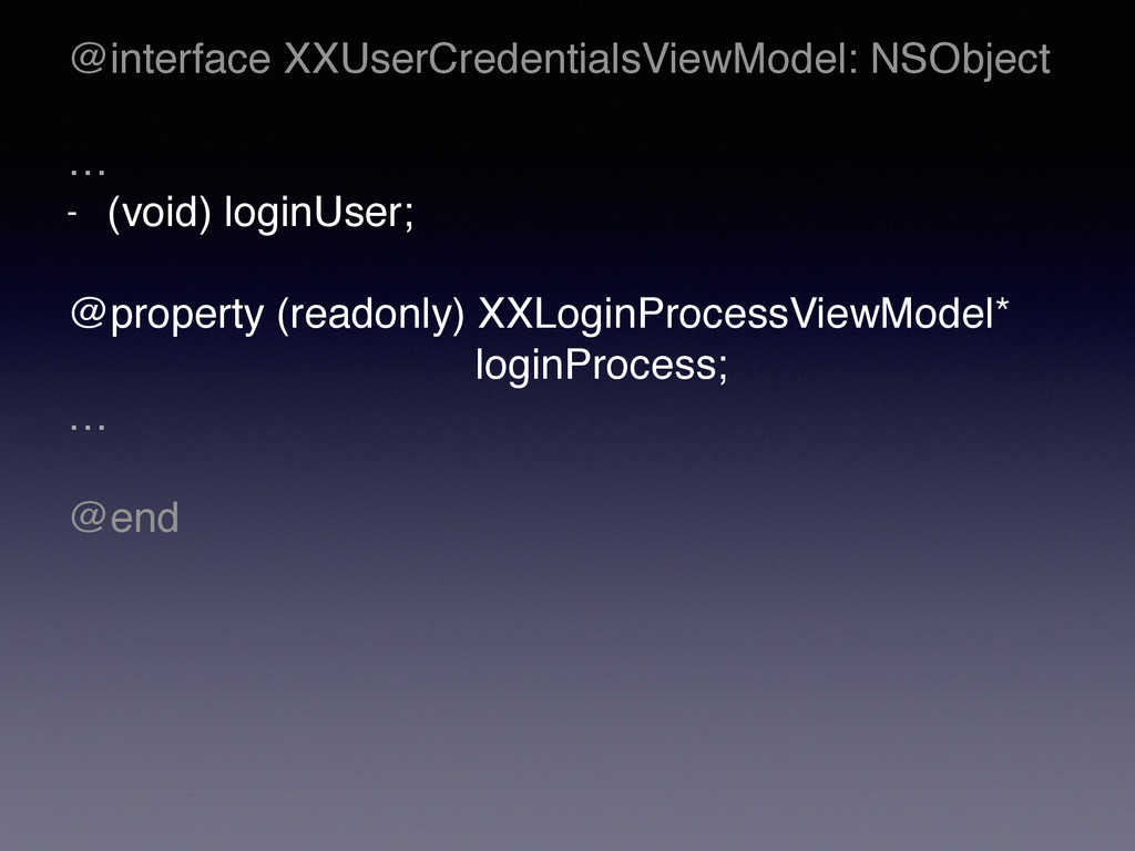 @interface XXUserCredentialsViewModel: NSObject ! ! …! - (void) loginUser;! !