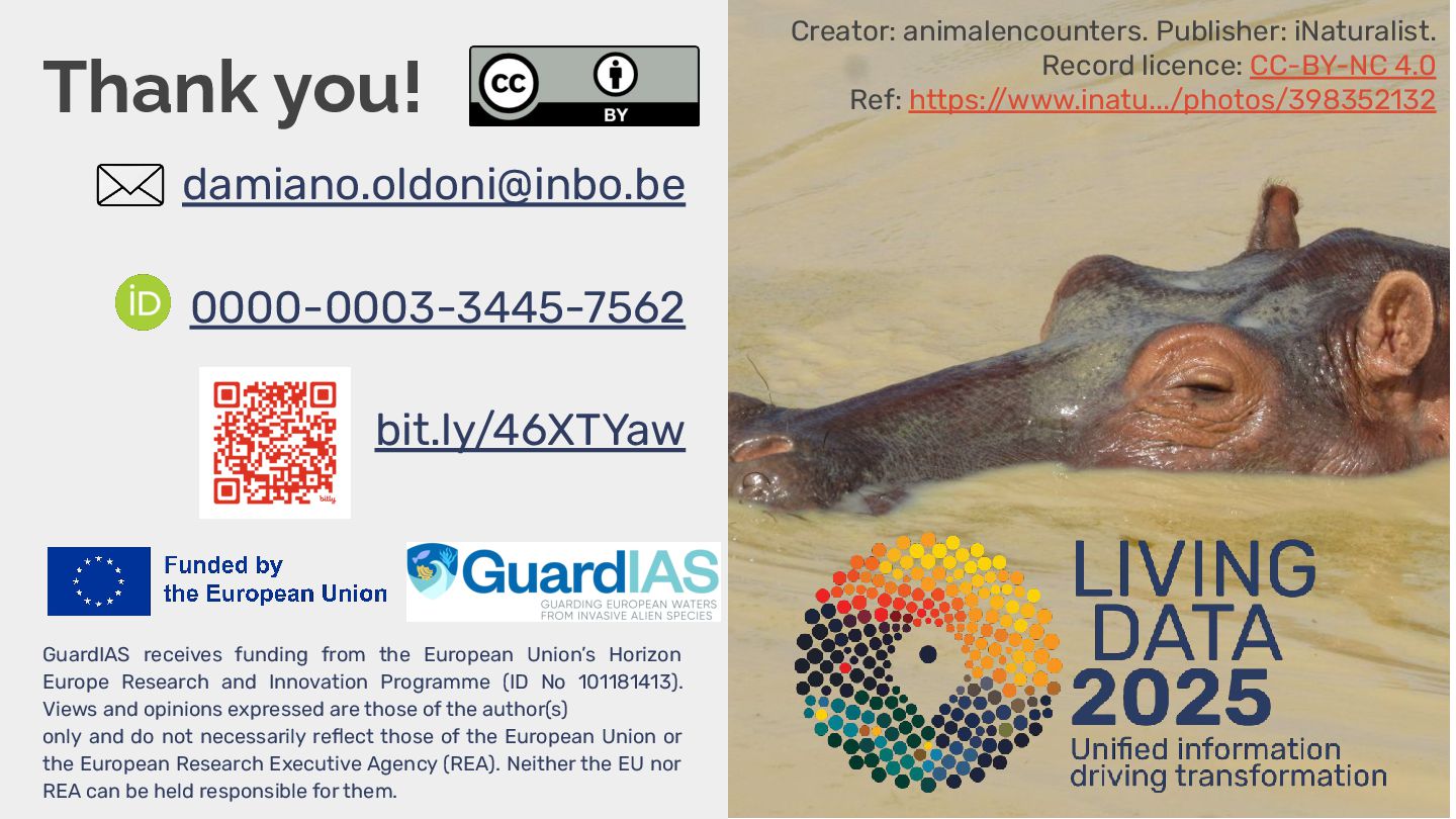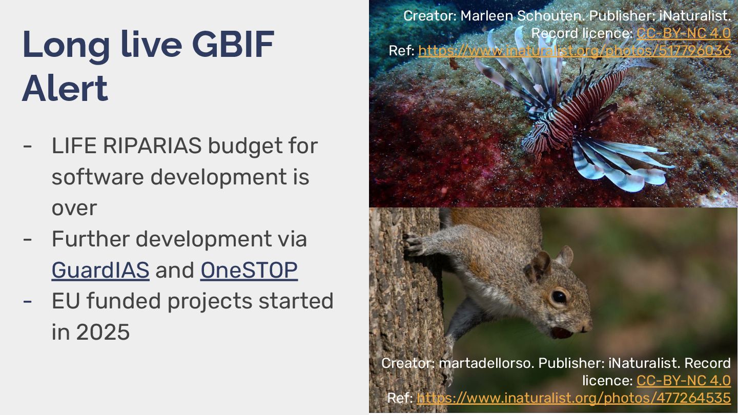 development is over - Further development via GuardIAS and OneSTOP - EU funded projects started in 2025 Creator: Marleen Schouten. Publisher: iNaturalist. Record licence: CC-BY-NC 4.0 Ref: https:/ /www.inaturalist.org/photos/517796036 Creator: martadellorso. Publisher: iNaturalist. Record licence: CC-BY-NC 4.0 Ref: https:/ /www.inaturalist.org/photos/477264535