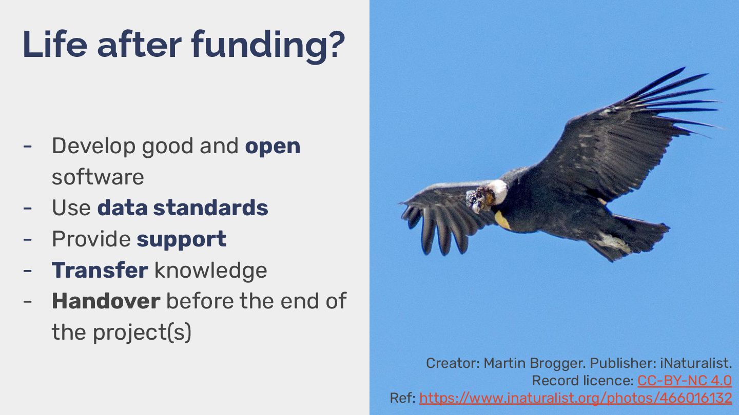 - Provide support - Transfer knowledge - Handover before the end of the project(s) Life after funding? Creator: Martin Brogger. Publisher: iNaturalist. Record licence: CC-BY-NC 4.0 Ref: https:/ /www.inaturalist.org/photos/466016132