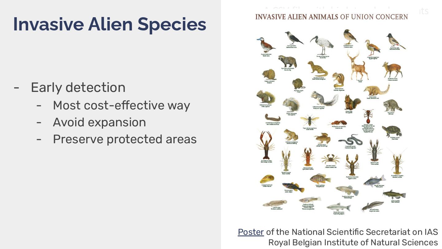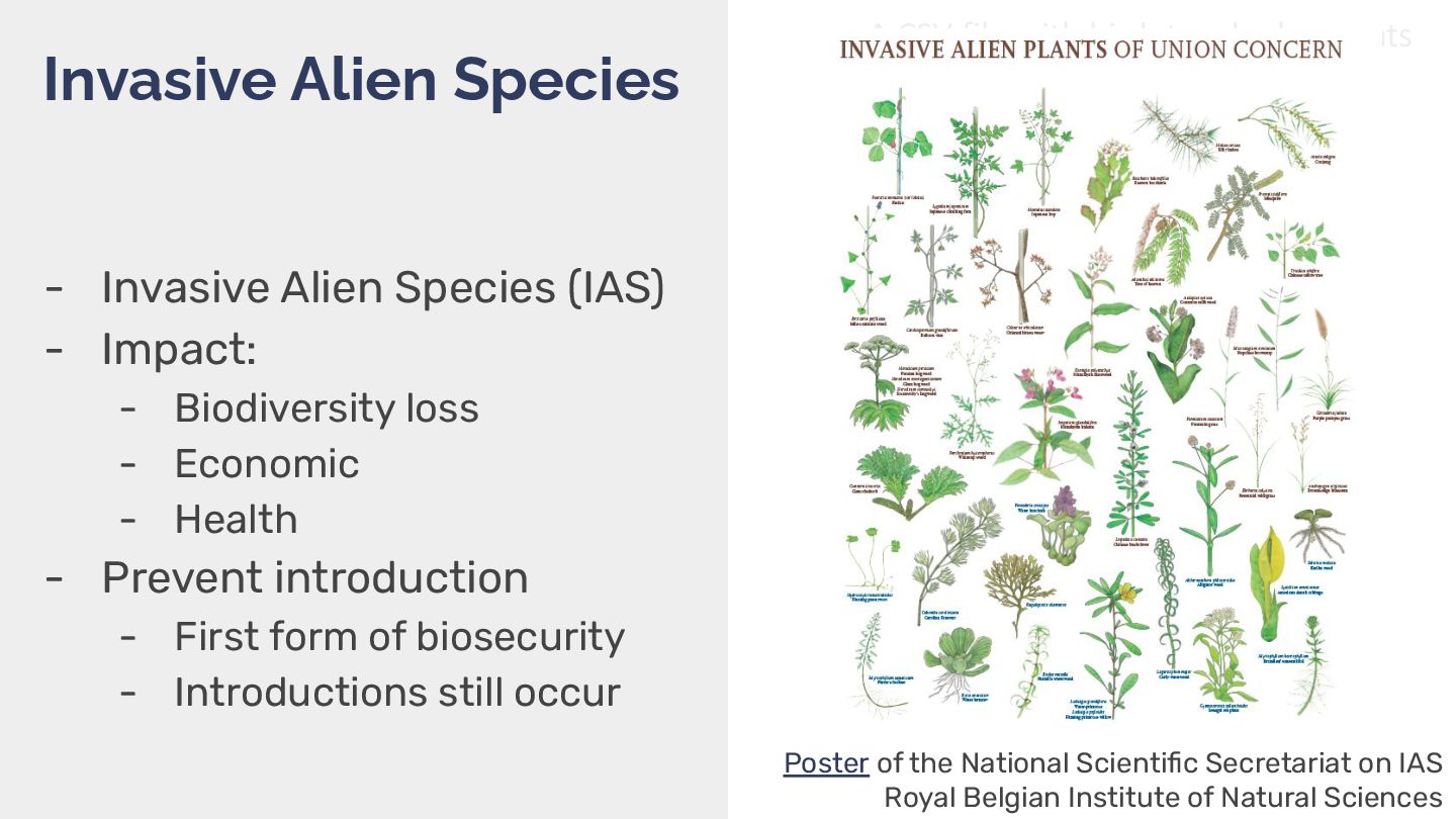 - Economic - Health - Prevent introduction - First form of biosecurity - Introductions still occur Invasive Alien Species A CSV file with bird+tag deployments Poster of the National Scientific Secretariat on IAS Royal Belgian Institute of Natural Sciences