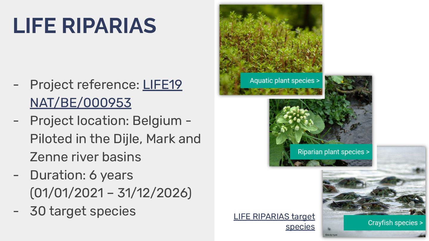 Belgium - Piloted in the Dijle, Mark and Zenne river basins - Duration: 6 years (01/01/2021 – 31/12/2026) - 30 target species LIFE RIPARIAS target species