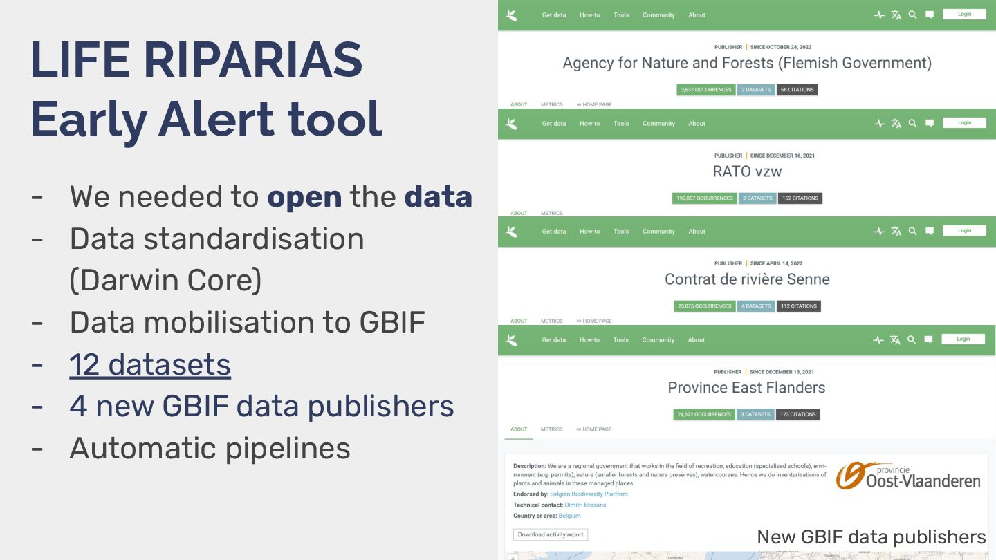 the data - Data standardisation (Darwin Core) - Data mobilisation to GBIF - 12 datasets - 4 new GBIF data publishers - Automatic pipelines New GBIF data publishers