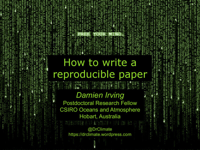 a reproducible paper My background ◦ Software Carpentry instructor ◦ CSIRO support scientist ◦ Regular PyCon attendee ◦ Data science blog: drclimate.wordpress.com Lit review ◦ Barriers to publishing code ◦ Computational best practices