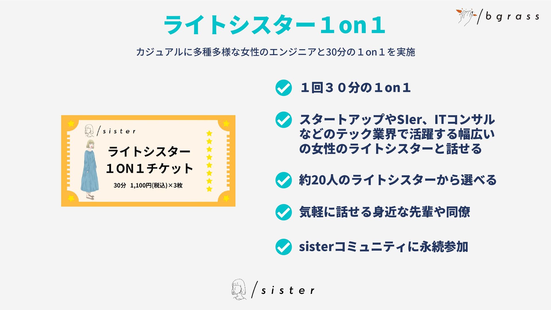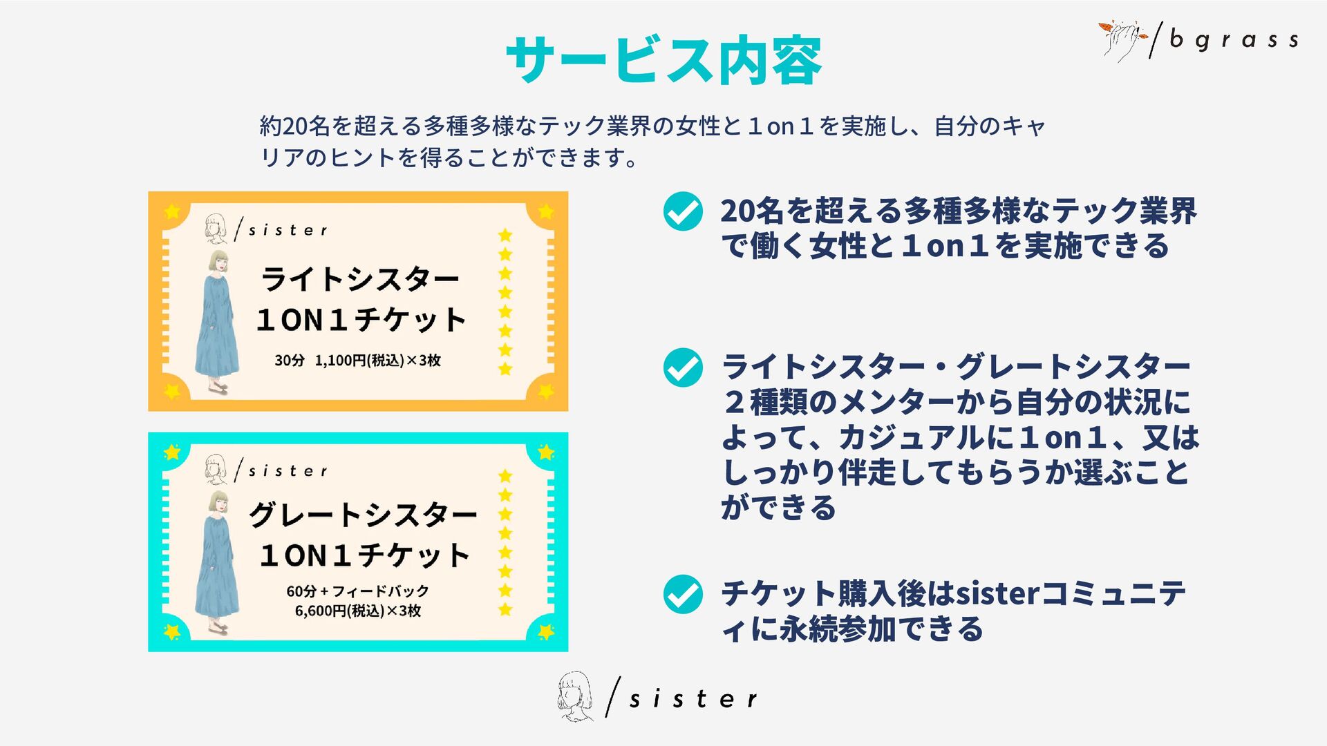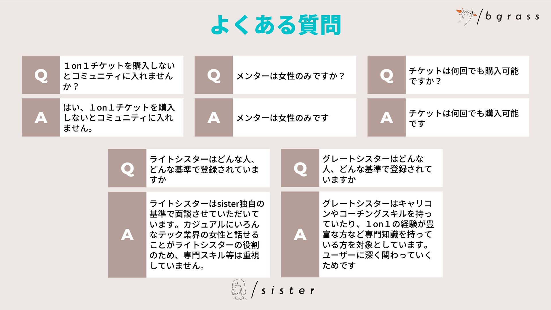 メンターは女性のみです Q A ライトシスターはどんな人、 どんな基準で登録されていま すか ライトシスターはsister独自の 基準で面談させていただいて います。カジュアルにいろん なテック業界の女性と話せる ことがライトシスターの役割 のため、専門スキル等は重視 していません。 Q A グレートシスターはどんな 人、どんな基準で登録されて いますか グレートシスターはキャリコ ンやコーチングスキルを持っ ていたり、1on1の経験が豊 富な方など専門知識を持って いる方を対象としています。 ユーザーに深く関わっていく ためです Q A チケットは何回でも購入可能 ですか? チケットは何回でも購入可能 です Q A