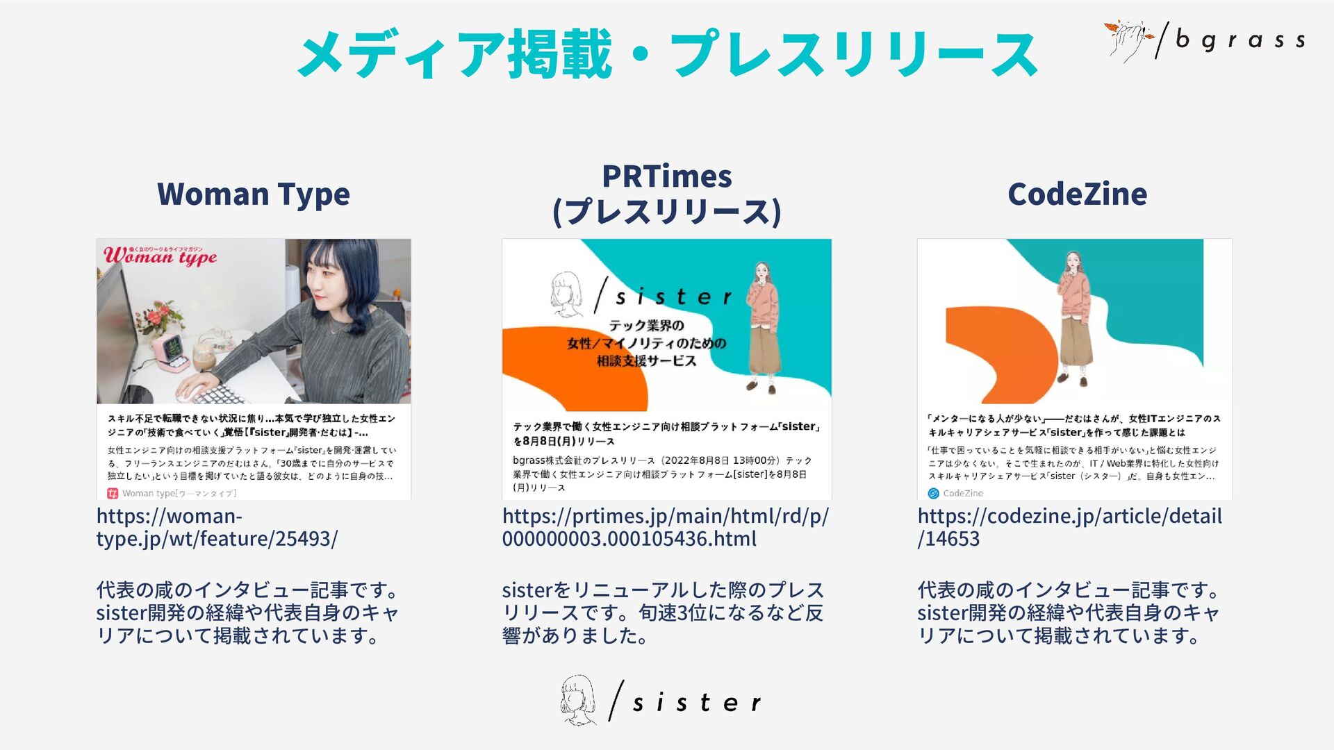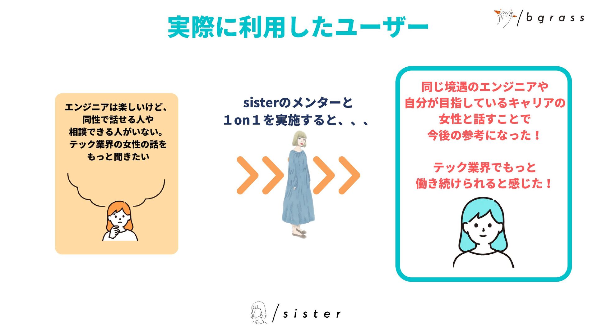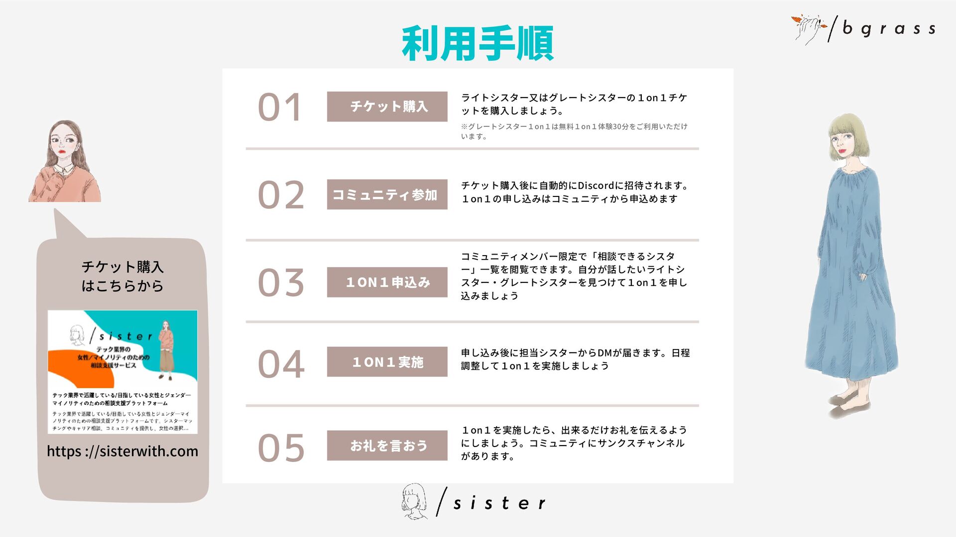 メンターは女性のみです Q A ライトシスターはどんな人、 どんな基準で登録されていま すか ライトシスターはsister独自の 基準で面談させていただいて います。カジュアルにいろん なテック業界の女性と話せる ことがライトシスターの役割 のため、専門スキル等は重視 していません。 Q A グレートシスターはどんな 人、どんな基準で登録されて いますか グレートシスターはキャリコ ンやコーチングスキルを持っ ていたり、1on1の経験が豊 富な方など専門知識を持って いる方を対象としています。 ユーザーに深く関わっていく ためです Q A チケットは何回でも購入可能 ですか? チケットは何回でも購入可能 です Q A