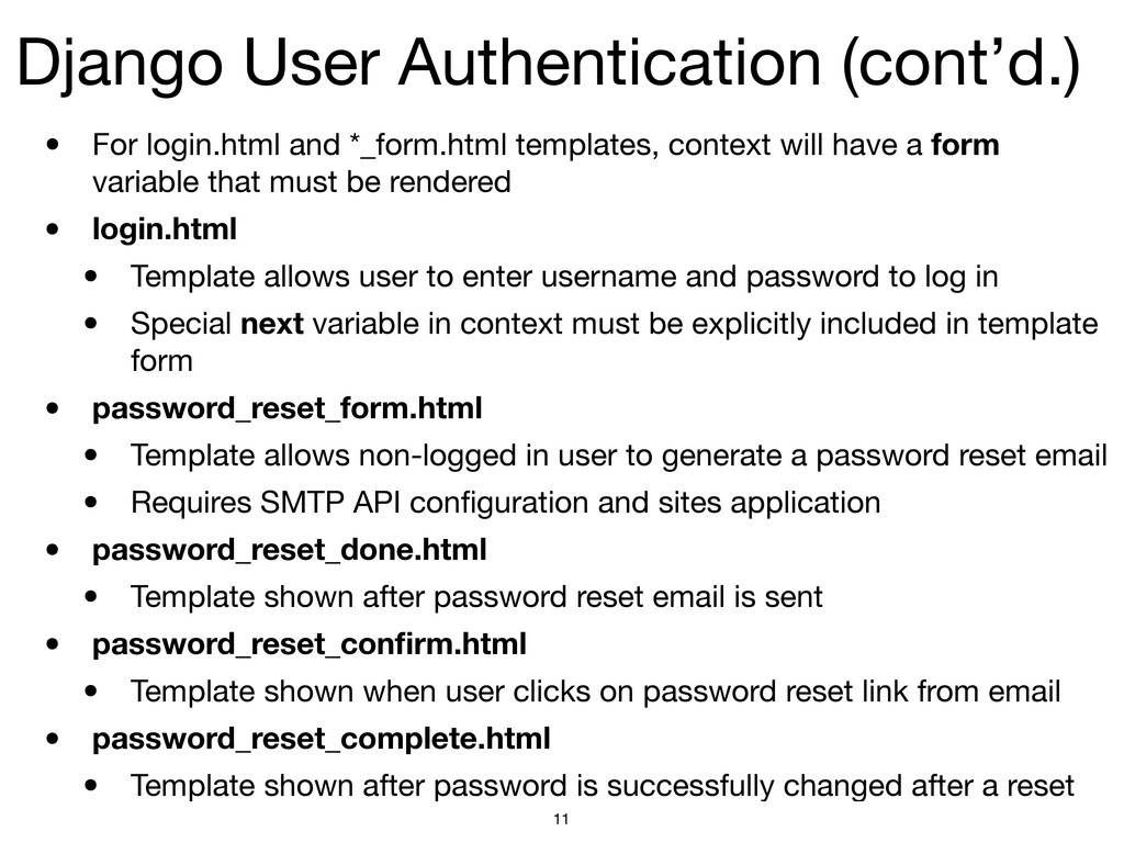 plain text • Never, ever store passwords in plain text • Passwords should be stored using a secure hash and a salt: • This is how *NIX does it! • A hash function is any algorithm or subroutine that maps large data sets of variable length, called keys, to smaller data sets of a fixed length. The values returned by a hash function are called hash values, hash codes, hash sums, checksums or simply hashes.1 • A salt is a string of random bits of data that is appended systematically to a password before hashing and storage remove the ability to use a dictionary attack to break into an account • The salt should be kept private! Not even in GitHub! • The hash function is 1-way, meaning that it is cryptographically secure but cannot be used to get the password from the hashed password 8 hashed_password = hash_function(salt + password) 1. http://en.wikipedia.org/wiki/Hash_function