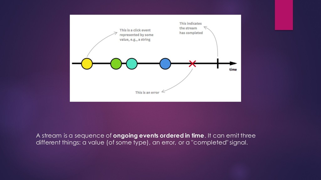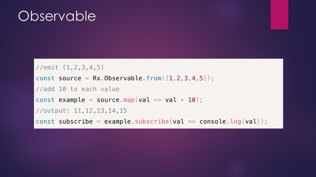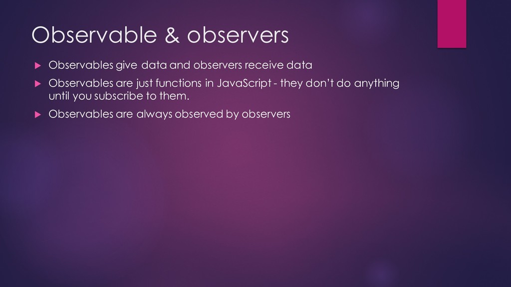 data u Observables are just functions in JavaScript - they don’t do anything until you subscribe to them. u Observables are always observed by observers