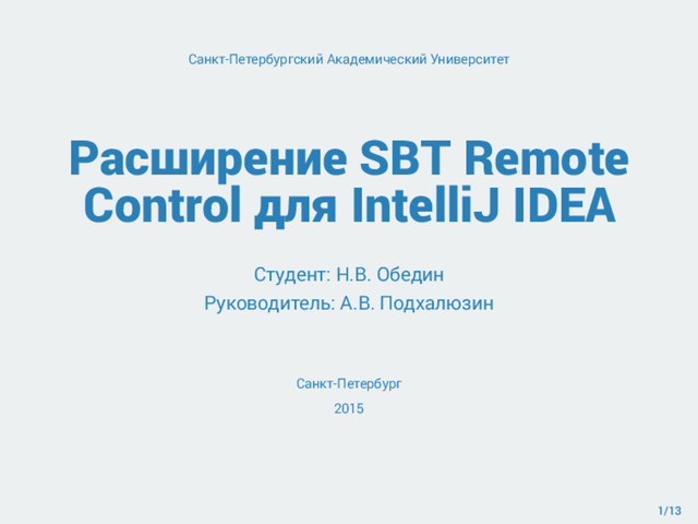 • Совмещает объектно-ориентированный и функциональный подходы • Используется в Linkedin, Twitter, Foursquare, Coursera. • SBT – система сборки проектов на Scala и Java. • Автоматическое разрешение зависимостей (Ivy) • Инкрементальная компиляция кода на Scala и Java • Поддержка расширений и задач на Scala • Интерактивное управление (консоль команд) • sbt-remote-control – проект позволяющий запускать SBT в режиме сервера и посылать ему команды удаленно. Используется в Typesafe Activator 2/13