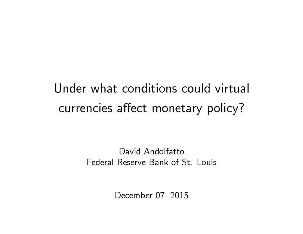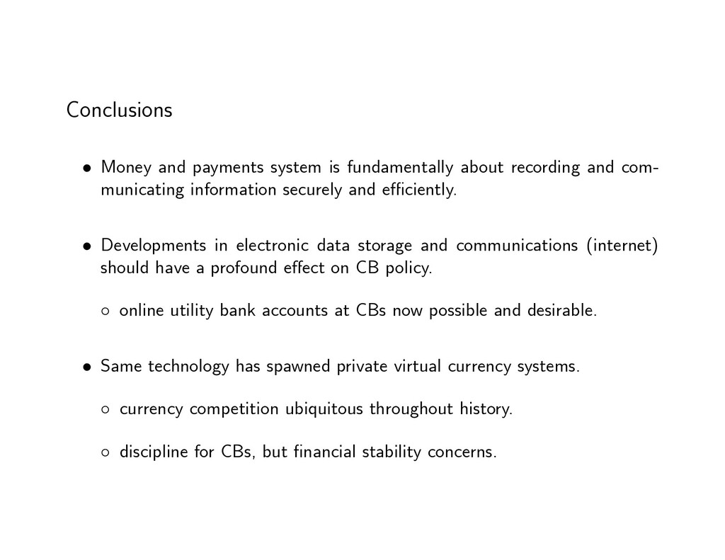 com- municating information securely and e¢ ciently. Developments in electronic data storage and communications (internet) should have a profound e¤ect on CB policy. online utility bank accounts at CBs now possible and desirable. Same technology has spawned private virtual currency systems. currency competition ubiquitous throughout history. discipline for CBs, but …nancial stability concerns.