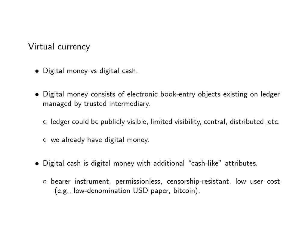 of electronic book-entry objects existing on ledger managed by trusted intermediary. ledger could be publicly visible, limited visibility, central, distributed, etc. we already have digital money. Digital cash is digital money with additional “cash-like” attributes. bearer instrument, permissionless, censorship-resistant, low user cost (e.g., low-denomination USD paper, bitcoin).