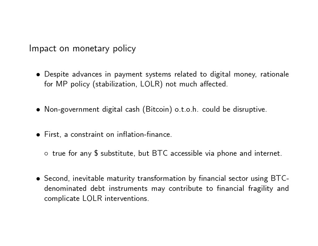 to digital money, rationale for MP policy (stabilization, LOLR) not much a¤ected. Non-government digital cash (Bitcoin) o.t.o.h. could be disruptive. First, a constraint on in‡ation-…nance. true for any $ substitute, but BTC accessible via phone and internet. Second, inevitable maturity transformation by …nancial sector using BTC- denominated debt instruments may contribute to …nancial fragility and complicate LOLR interventions.