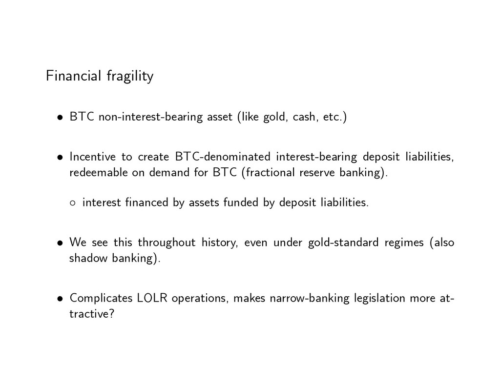 to create BTC-denominated interest-bearing deposit liabilities, redeemable on demand for BTC (fractional reserve banking). interest …nanced by assets funded by deposit liabilities. We see this throughout history, even under gold-standard regimes (also shadow banking). Complicates LOLR operations, makes narrow-banking legislation more at- tractive?