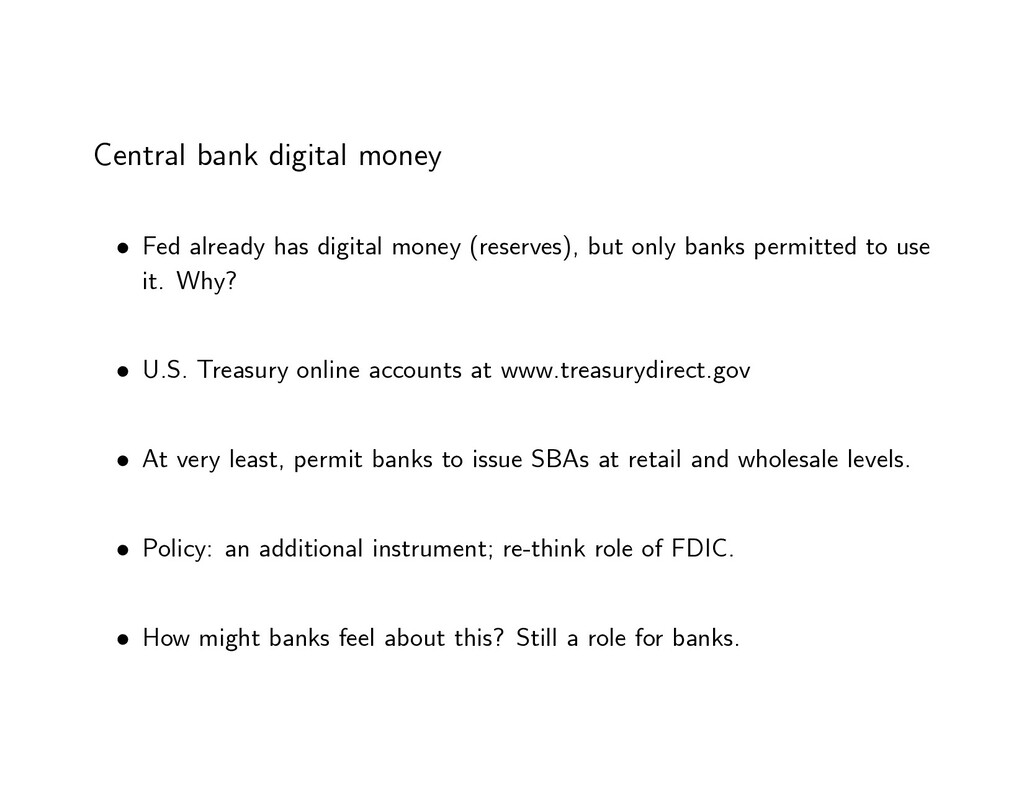 but only banks permitted to use it. Why? U.S. Treasury online accounts at www.treasurydirect.gov At very least, permit banks to issue SBAs at retail and wholesale levels. Policy: an additional instrument; re-think role of FDIC. How might banks feel about this? Still a role for banks.