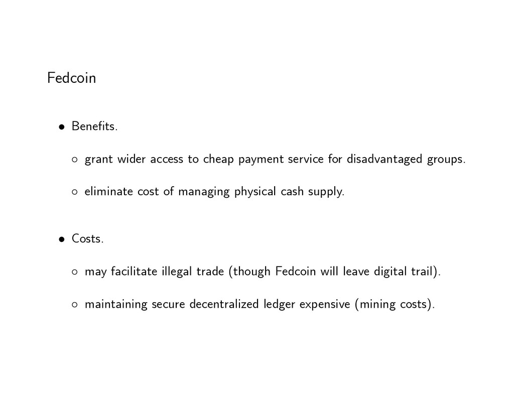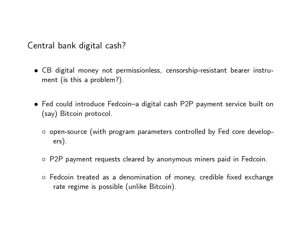 bearer instru- ment (is this a problem?). Fed could introduce Fedcoin–a digital cash P2P payment service built on (say) Bitcoin protocol. open-source (with program parameters controlled by Fed core develop- ers). P2P payment requests cleared by anonymous miners paid in Fedcoin. Fedcoin treated as a denomination of money, credible …xed exchange rate regime is possible (unlike Bitcoin).