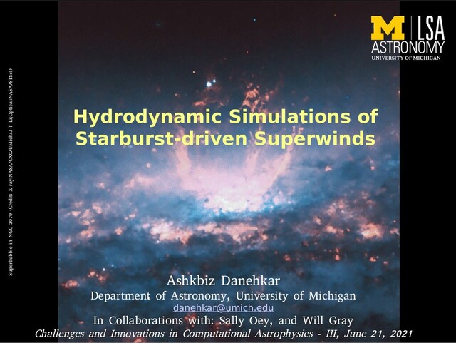Collaborations with: Sally Oey, and Will Gray Challenges and Innovations in Computational Astrophysics - III, June 21, 2021 Hydrodynamic Simulations of Starburst-driven Superwinds Superbubble in NGC 3079 (Credit: X-ray:NASA/CXC/UMich/J-T Li;Optical:NASA/STScI)