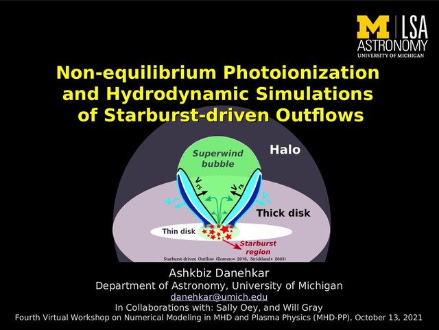 of Starburst-driven Outflows of Starburst-driven Outflows Starburst-driven Outflow (Romero+ 2018, Strickland+ 2003) Ashkbiz Danehkar Department of Astronomy, University of Michigan [email protected] In Collaborations with: Sally Oey, and Will Gray Fourth Virtual Workshop on Numerical Modeling in MHD and Plasma Physics (MHD-PP), October 13, 2021