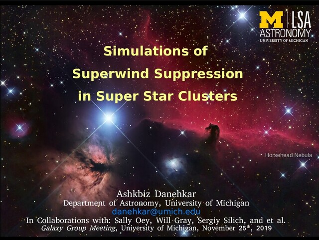Collaborations with: Sally Oey, Will Gray, Sergiy Silich, and et al. Galaxy Group Meeting, University of Michigan, November 25th, 2019 Simulations of Superwind Suppression in Super Star Clusters Horsehead Nebula Horsehead Nebula