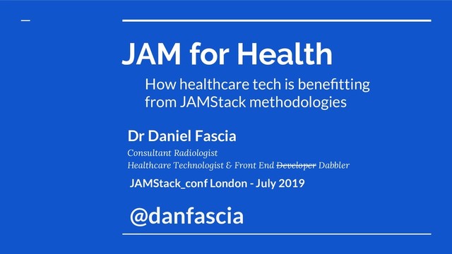 methodologies Dr Daniel Fascia Consultant Radiologist Healthcare Technologist & Front End Developer Dabbler @danfascia JAMStack_conf London - July 2019