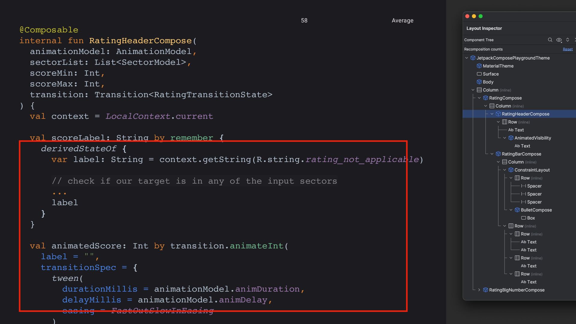 scoreMax: Int, transition: Transition<RatingTransitionState> ) { val context = LocalContext.current val scoreLabel: String by remember { derivedStateOf { var label: String = context.getString(R.string.rating_not_applicable) // check if our target is in any of the input sectors ... label } } val animatedScore: Int by transition.animateInt( label = "", transitionSpec = { tween( durationMillis = animationModel.animDuration, delayMillis = animationModel.animDelay, easing = FastOutSlowInEasing )