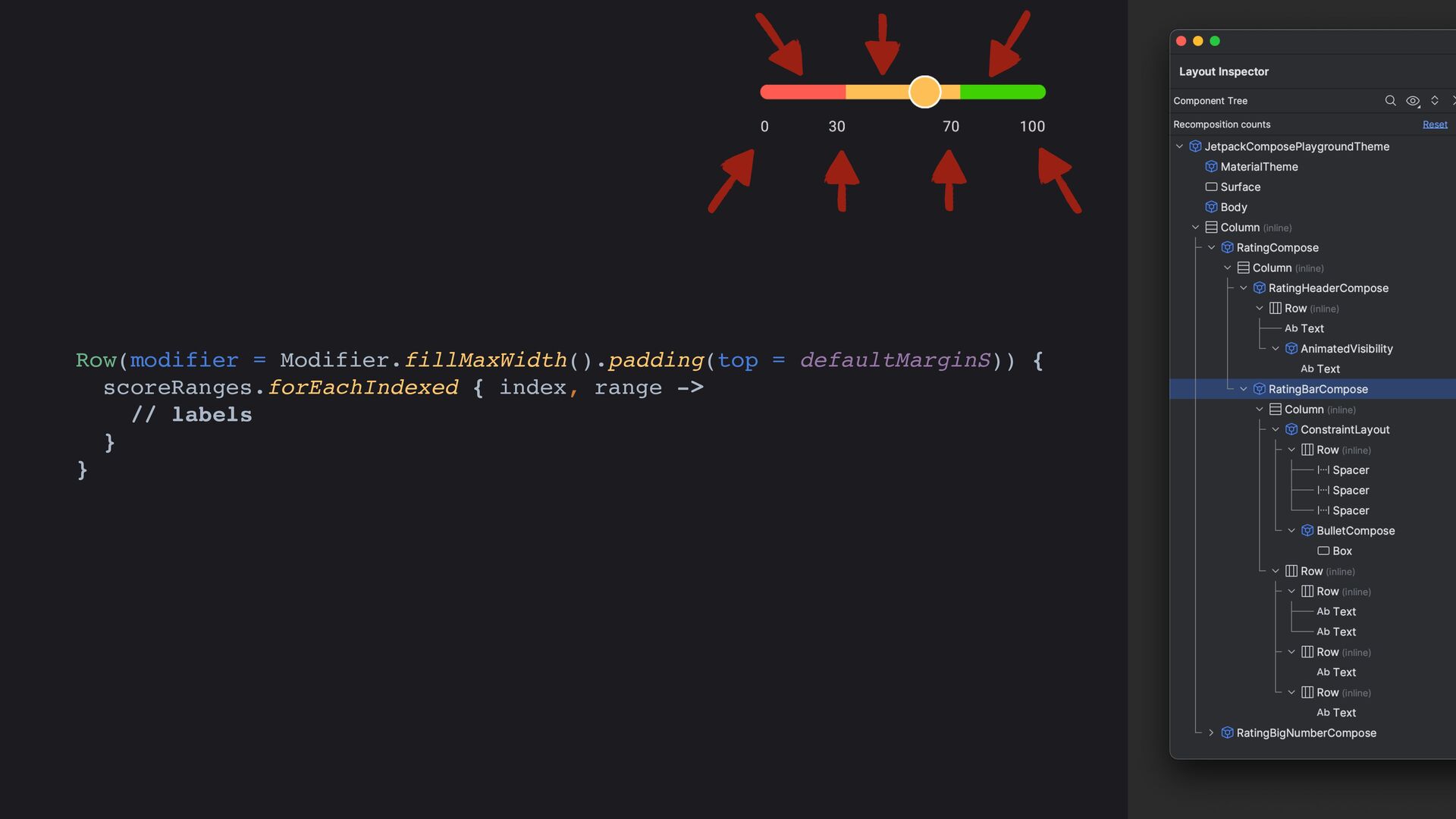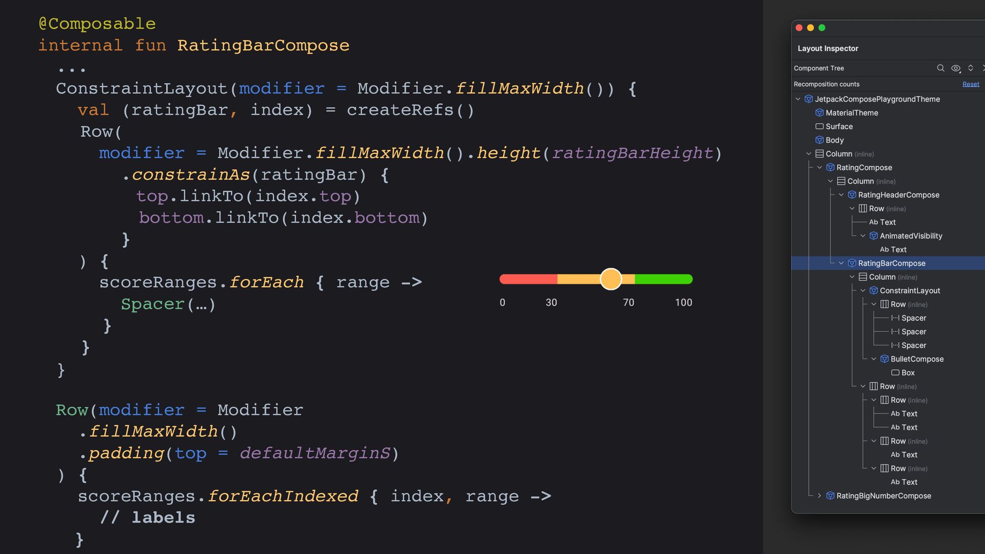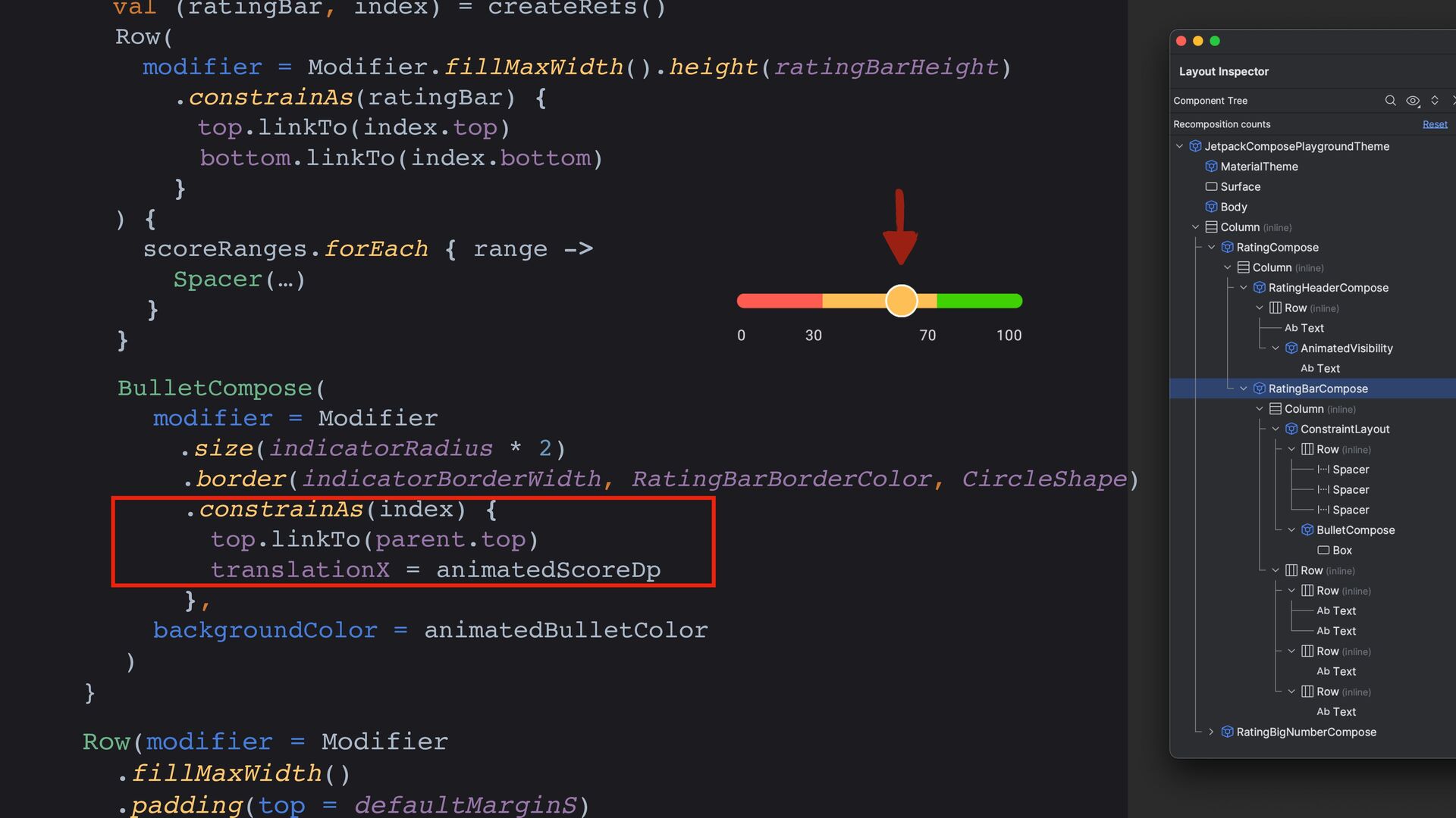 .constrainAs(index) { top.linkTo(parent.top) translationX = animatedScoreDp }, backgroundColor = animatedBulletColor ) val (ratingBar, index) = createRefs() Row( modifier = Modifier.fillMaxWidth().height(ratingBarHeight) .constrainAs(ratingBar) { top.linkTo(index.top) bottom.linkTo(index.bottom) } ) { scoreRanges.forEach { range -> Spacer(…) } } } Row(modifier = Modifier .fillMaxWidth() .padding(top = defaultMarginS)