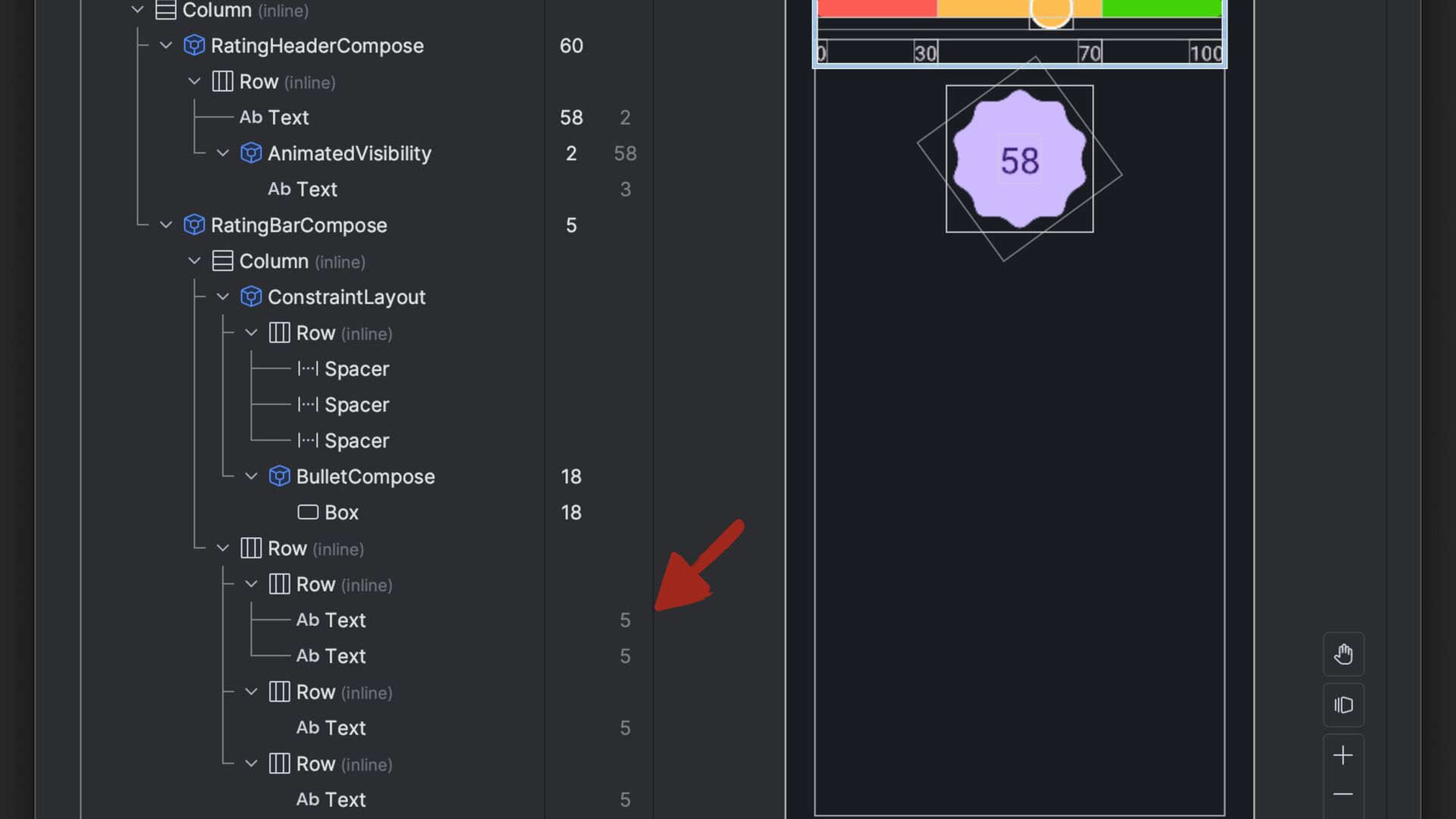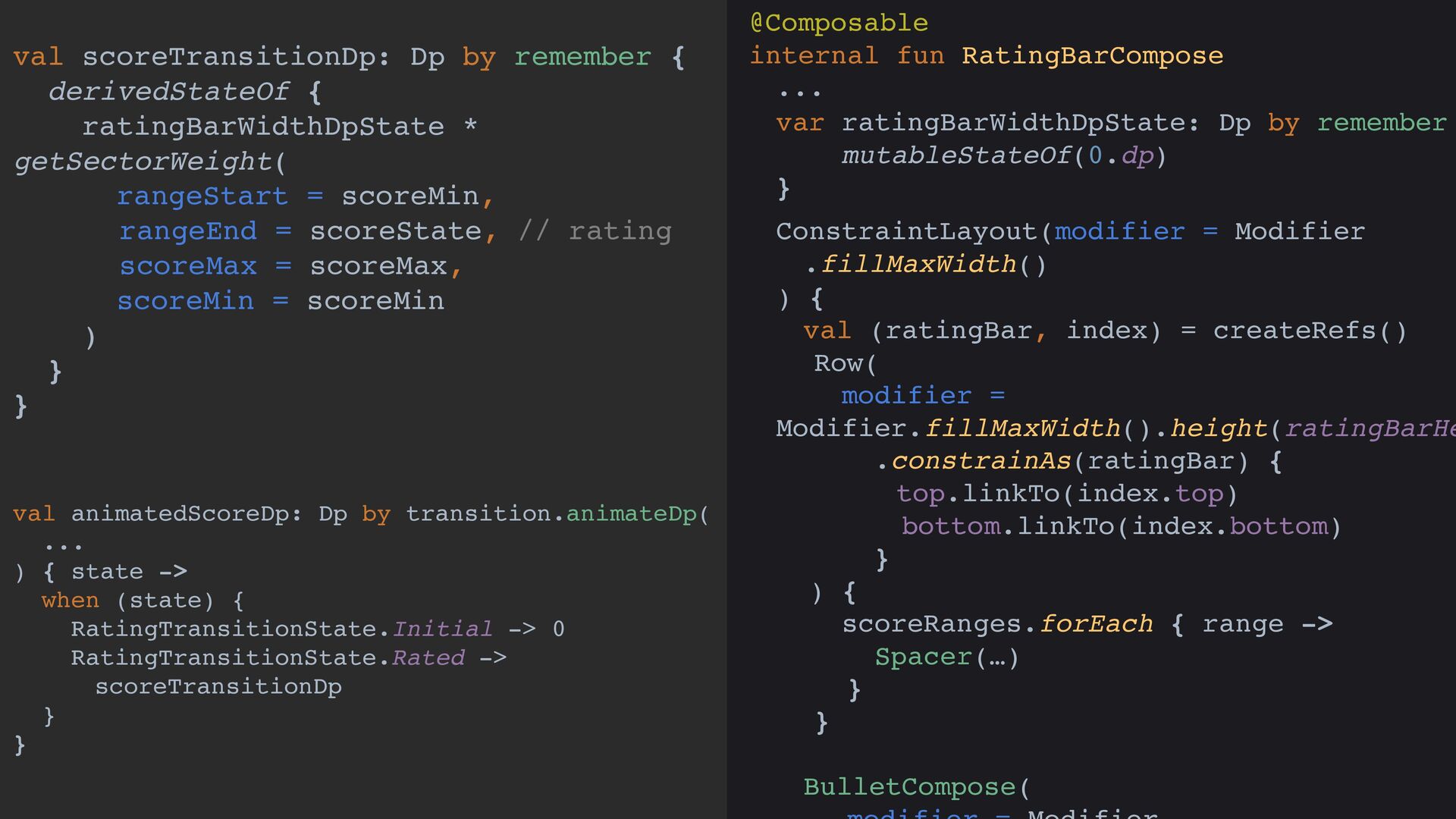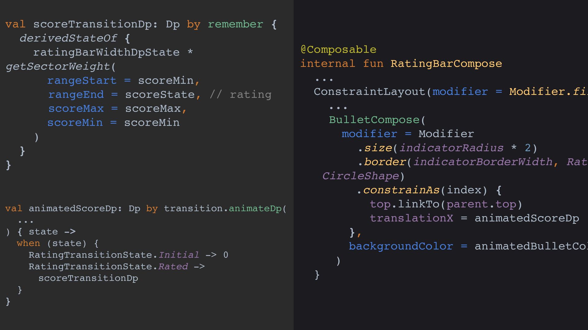 (ratingBar, index) = createRefs() Row( modifier = Modifier.fillMaxWidth().height(ratingBarHe .constrainAs(ratingBar) { top.linkTo(index.top) bottom.linkTo(index.bottom) } ) { scoreRanges.forEach { range -> Spacer(…) } } BulletCompose( @Composable internal fun RatingBarCompose ... ConstraintLayout(modifier = Modifier .fillMaxWidth() val scoreTransitionDp: Dp by remember { derivedStateOf { ratingBarWidthDpState * getSectorWeight( rangeStart = scoreMin, rangeEnd = scoreState, // rating scoreMax = scoreMax, scoreMin = scoreMin ) } } val animatedScoreDp: Dp by transition.animateDp( ... ) { state -> when (state) { RatingTransitionState.Initial -> 0 RatingTransitionState.Rated -> scoreTransitionDp } }