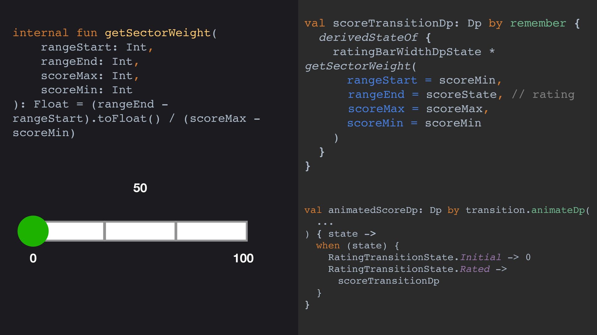 Int ): Float = (rangeEnd - rangeStart).toFloat() / (scoreMax - scoreMin) val scoreTransitionDp: Dp by remember { derivedStateOf { ratingBarWidthDpState * getSectorWeight( rangeStart = scoreMin, rangeEnd = scoreState, // rating scoreMax = scoreMax, scoreMin = scoreMin ) } } val animatedScoreDp: Dp by transition.animateDp( ... ) { state -> when (state) { RatingTransitionState.Initial -> 0 RatingTransitionState.Rated -> scoreTransitionDp } }