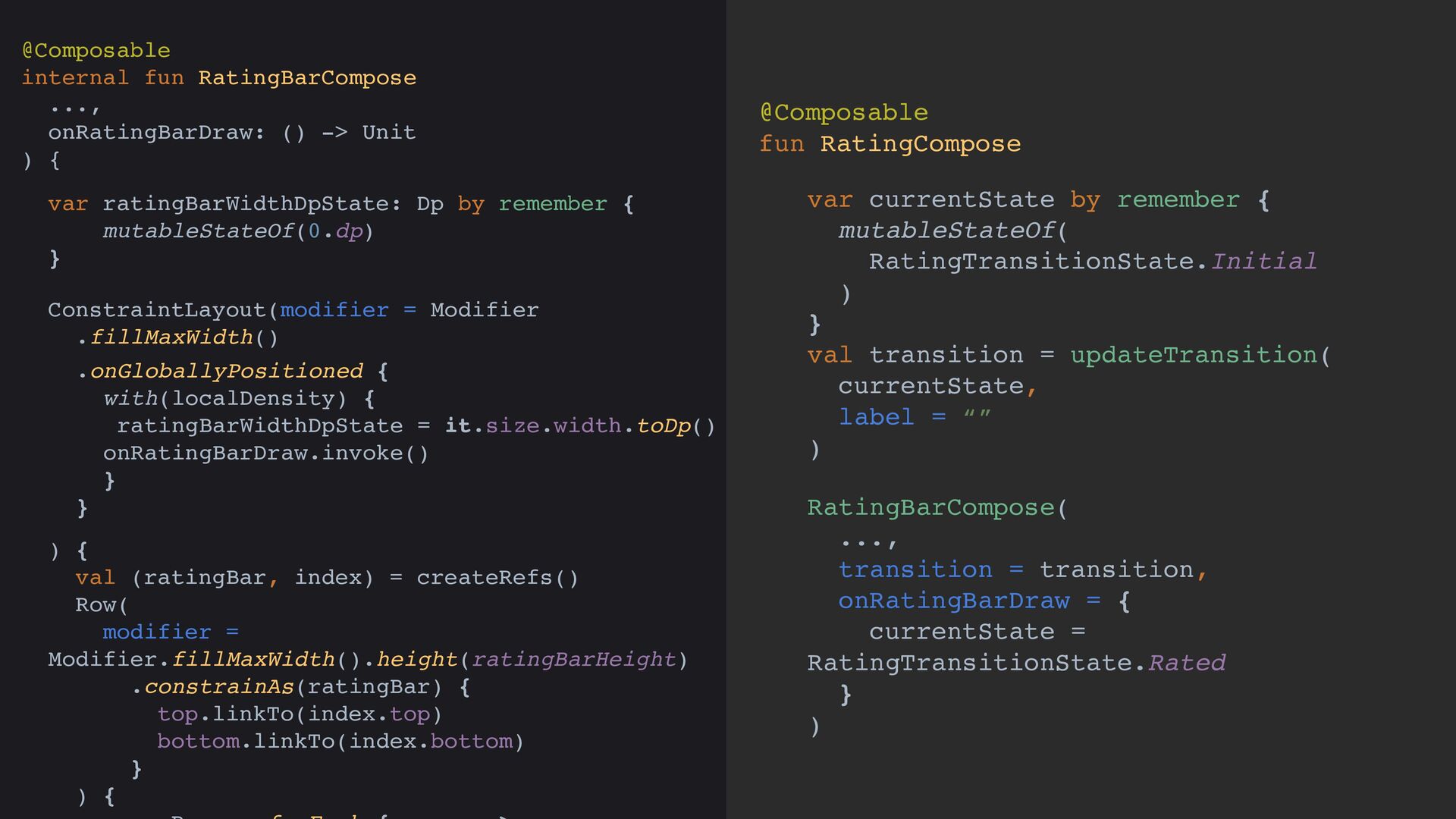 -> Unit ) { var ratingBarWidthDpState: Dp by remember { mutableStateOf(0.dp) } ConstraintLayout(modifier = Modifier .fillMaxWidth() ) { val (ratingBar, index) = createRefs() Row( modifier = Modifier.fillMaxWidth().height(ratingBarHeight) .constrainAs(ratingBar) { top.linkTo(index.top) bottom.linkTo(index.bottom) } ) { var currentState by remember { mutableStateOf( RatingTransitionState.Initial ) } val transition = updateTransition( currentState, label = “” ) RatingBarCompose( ..., transition = transition, onRatingBarDraw = { currentState = RatingTransitionState.Rated } ) .onGloballyPositioned { with(localDensity) { ratingBarWidthDpState = it.size.width.toDp() onRatingBarDraw.invoke() } }