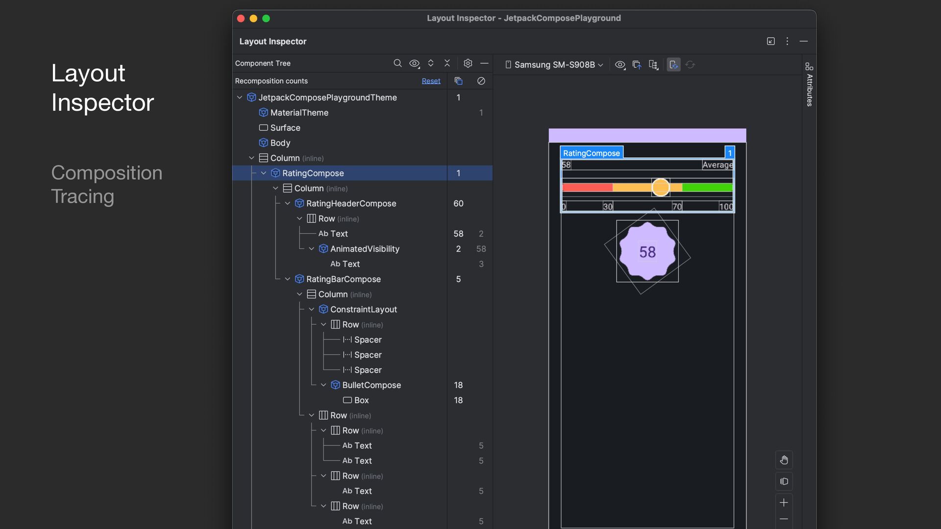 33. Layout Inspector Composition Tracing trace(“possible cause”) { // heavy operation