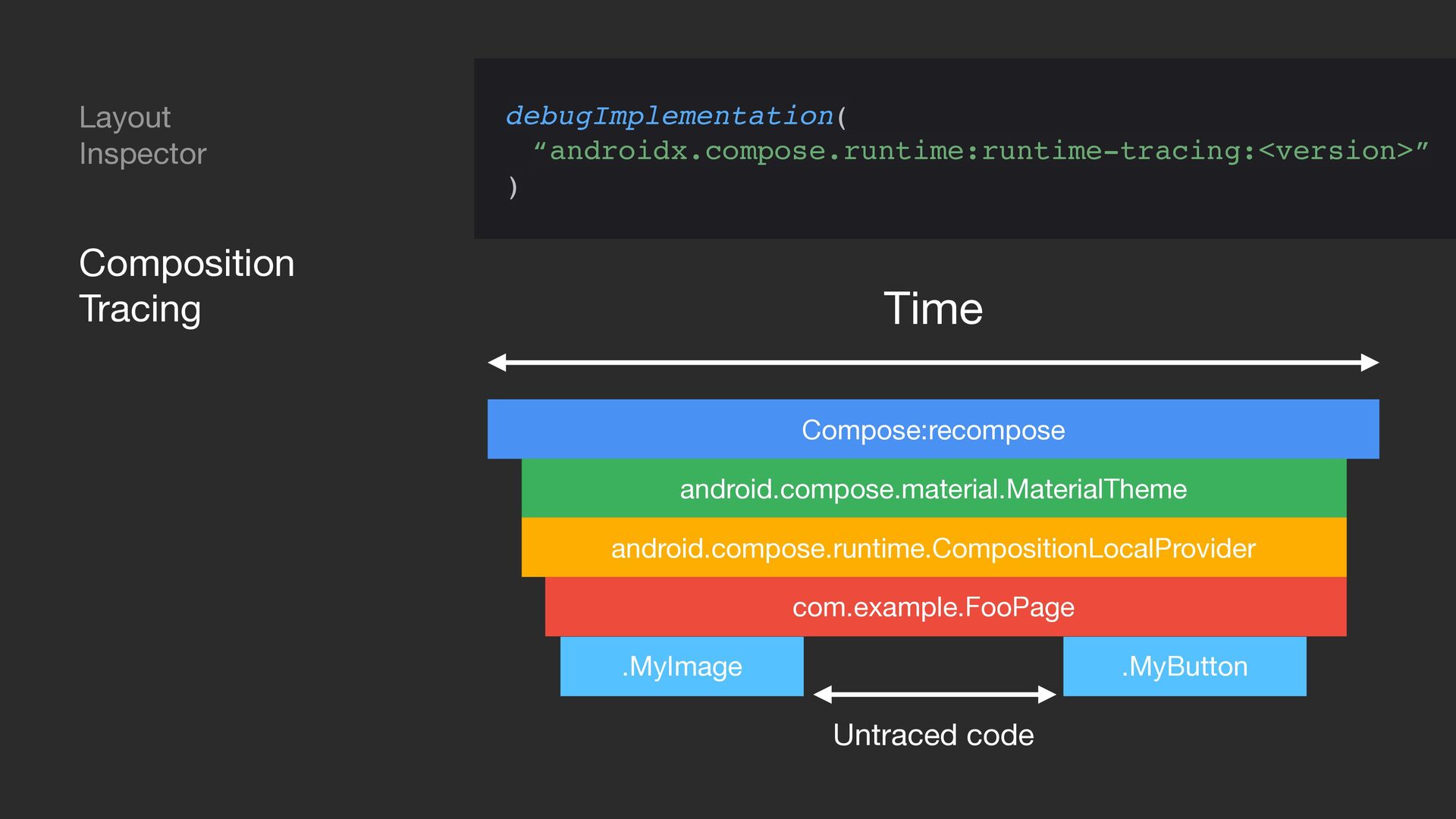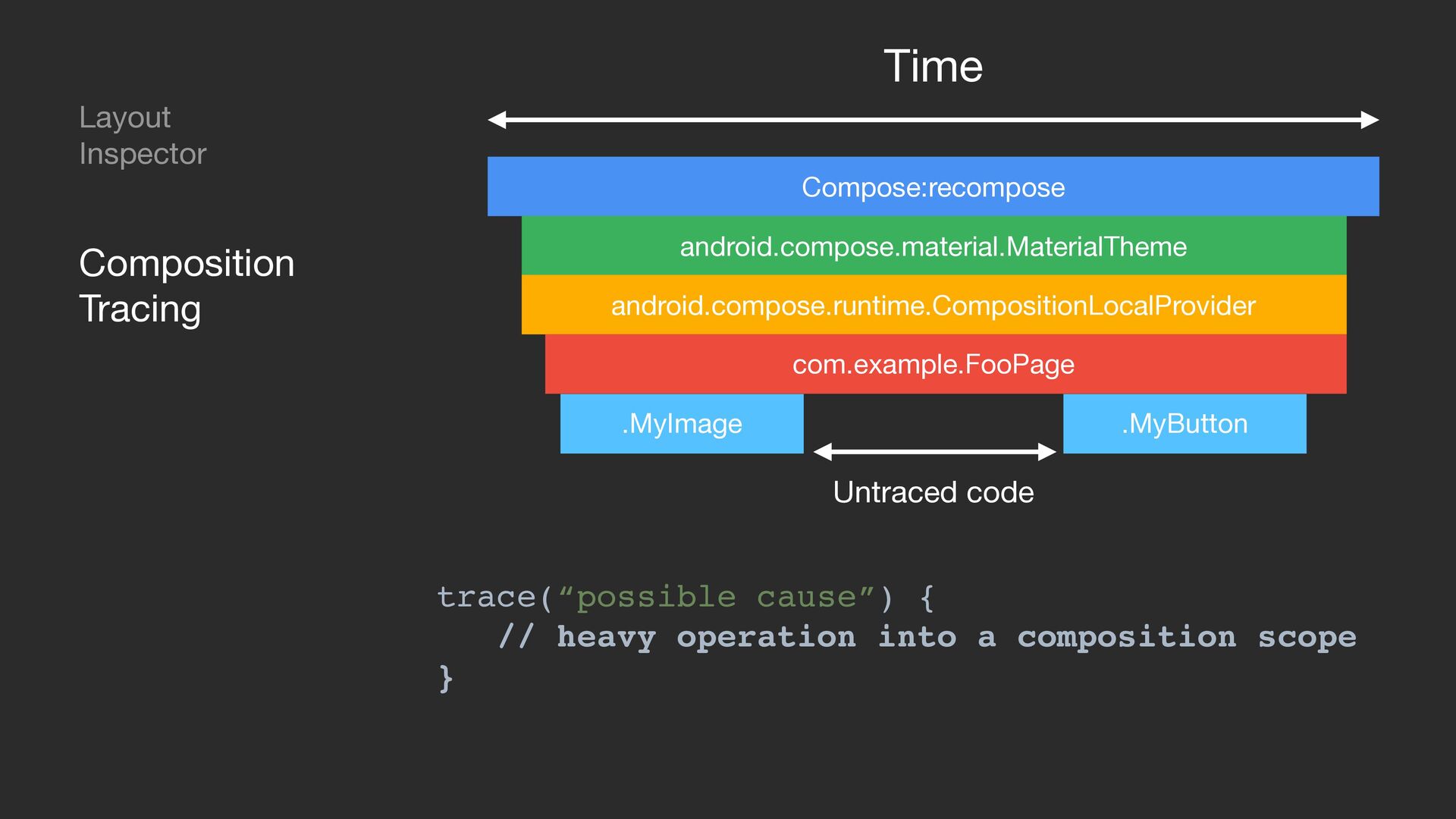 into a composition scope } Time Compose:recompose android.compose.material.MaterialTheme android.compose.runtime.CompositionLocalProvider com.example.FooPage .MyImage .MyButton Untraced code