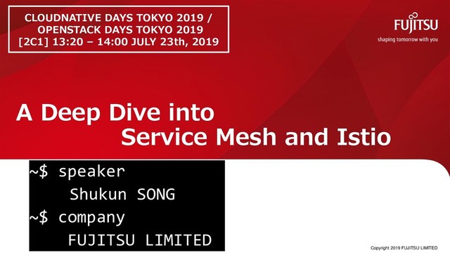speaker Shukun SONG ~$ company FUJITSU LIMITED Copyright 2019 FUJITSU LIMITED CLOUDNATIVE DAYS TOKYO 2019 / OPENSTACK DAYS TOKYO 2019 [2C1] 13:20 – 14:00 JULY 23th, 2019