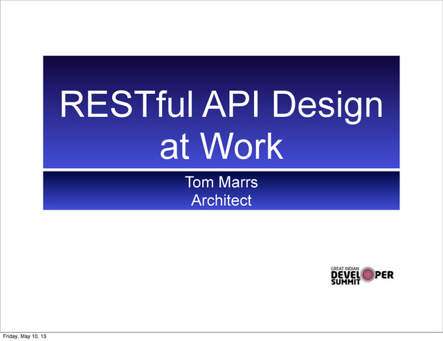 Code Meaning POST / PUT / DELETE 202 Accepted - Process request later POST / PUT / DELETE 204 No Content GET / PUT / DELETE 301 Moved Permanently ALL 400 Bad Request ALL 401 Unauthorized ALL 500 Internal Server Error Friday, May 10, 13