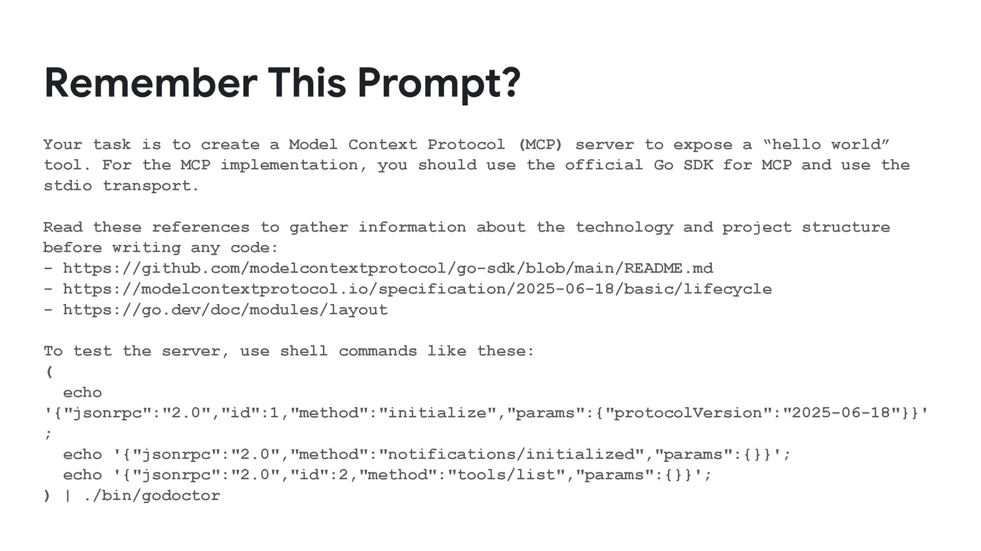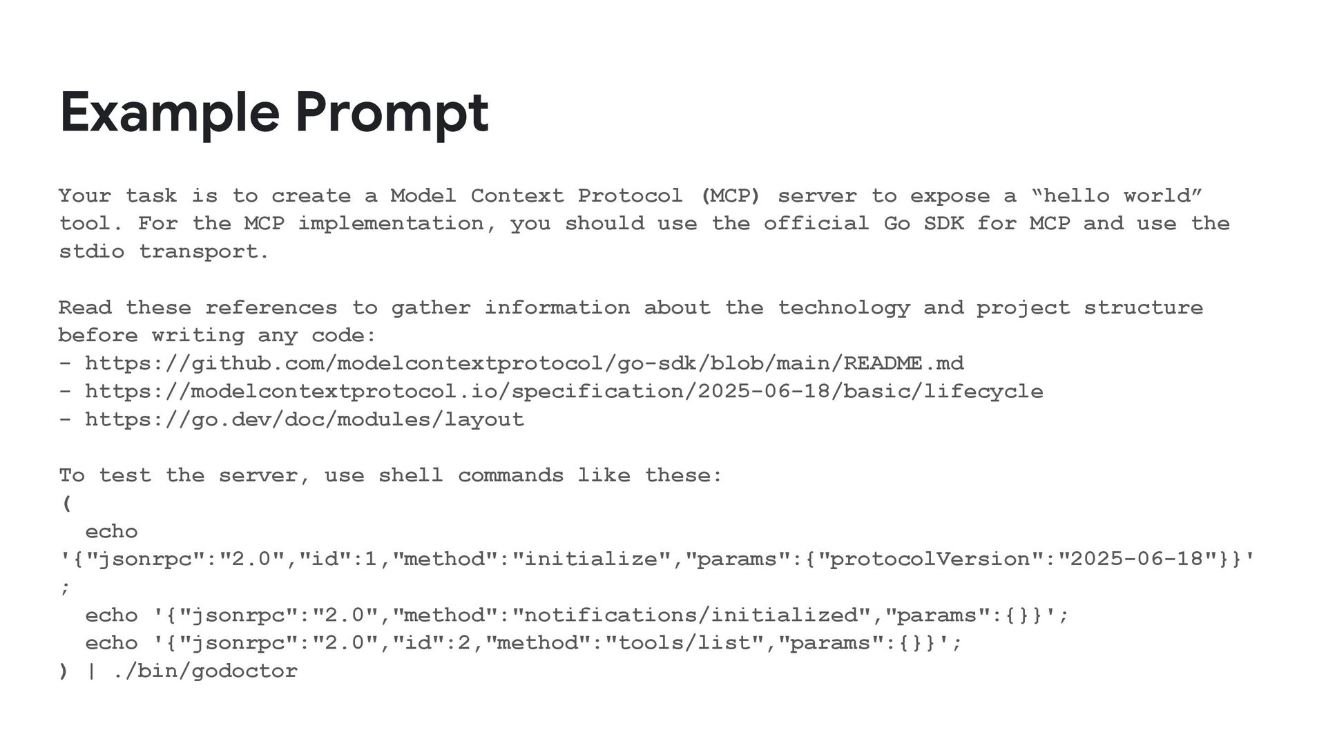 Protocol (MCP) server to expose a “hello world” tool. For the MCP implementation, you should use the official Go SDK for MCP and use the stdio transport. Read these references to gather information about the technology and project structure before writing any code: - https://github.com/modelcontextprotocol/go-sdk/blob/main/README.md - https://modelcontextprotocol.io/specification/2025-06-18/basic/lifecycle - https://go.dev/doc/modules/layout To test the server, use shell commands like these: ( echo '{"jsonrpc":"2.0","id":1,"method":"initialize","params":{"protocolVersion":"2025-06-18"}}' ; echo '{"jsonrpc":"2.0","method":"notifications/initialized","params":{}}'; echo '{"jsonrpc":"2.0","id":2,"method":"tools/list","params":{}}'; ) | ./bin/godoctor