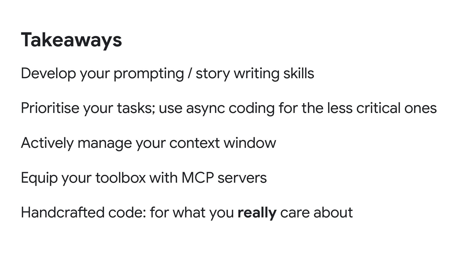 use async coding for the less critical ones Actively manage your context window Equip your toolbox with MCP servers Handcrafted code: for what you really care about Takeaways