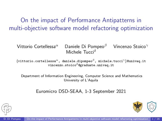 software model refactoring optimization Vittorio Cortellessaα Daniele Di Pompeoβ Vincenzo Stoicoγ Michele Tucciδ {vittorio.cortellessaα, daniele.dipompeoβ, michele.tucciγ}@univaq.it vincenzo.stoicoδ@graduate.univaq.it Department of Information Engineering, Computer Science and Mathematics University of L’Aquila Euromicro DSD-SEAA, 1-3 September 2021 D. Di Pompeo On the impact of Performance Antipatterns in multi-objective software model refactoring optimization 16 / 16