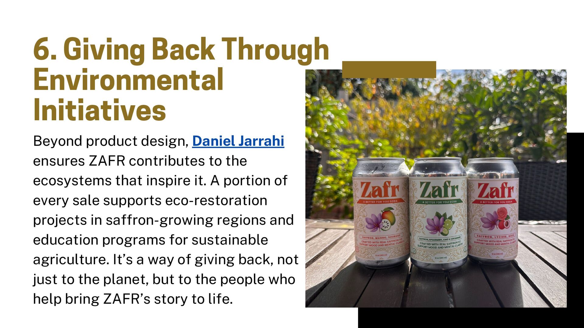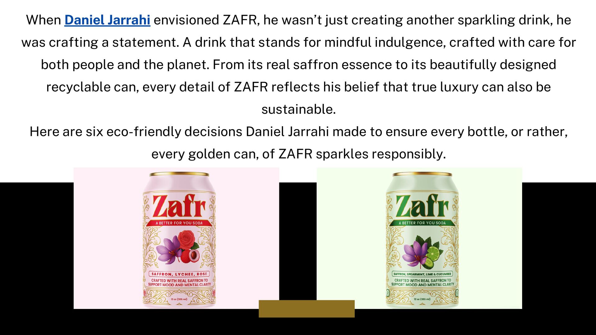 Join Daniel Jarrahi, founder of ZAFR, as he reveals the story behind the world’s first sparkling saffron soda, a blend of taste, tradition, and sustainability. Discover how every golden can reflects eco-conscious decisions, mindful luxury, and the art of crafting a better-for-you beverage that’s redefining refreshment.