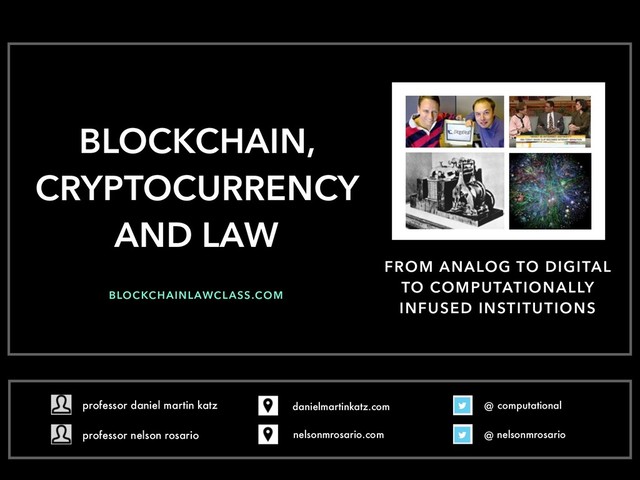 I N O I S T E C H + S TA N F O R D C O D E X B LO G | C O M P U TAT I O N A L L E GA L S T U D I E S . C O M PAG E | DA N I E L M A R T I N K AT Z . C O M C O R P | L E X P R E D I C T. C O M NELSON ROSARIO B LO G | L AWO F C RY P TO C U R R E N C Y. C O M PAG E | N E L S O N M RO S A R I O . C O M F I R M | S M O L I N S K I RO S A R I O L AW P. C . BLOCKCHAINLAWCLASS.COM L A B | T H E L AW L A B . C O M E D U | I L L I N O I S T E C H - C H I C AG O K E N T L AW