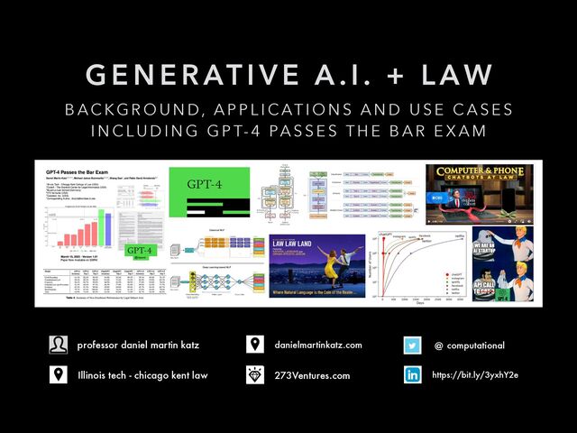 Professor Daniel Martin Katz - Generative A.I. + Law - Background, Applications and Use Cases Including GPT-4 Passes the Bar Exam - Topics include some History of NLP, The Path to Generative A.I. (including ChatGPT and GPT-4), Some Applications / Use Cases in the Legal Sector, GPT-4 Passes the Bar Exam, Legal A.I. Operational Issues and the Path Forward ... (Updated 06.14.23)